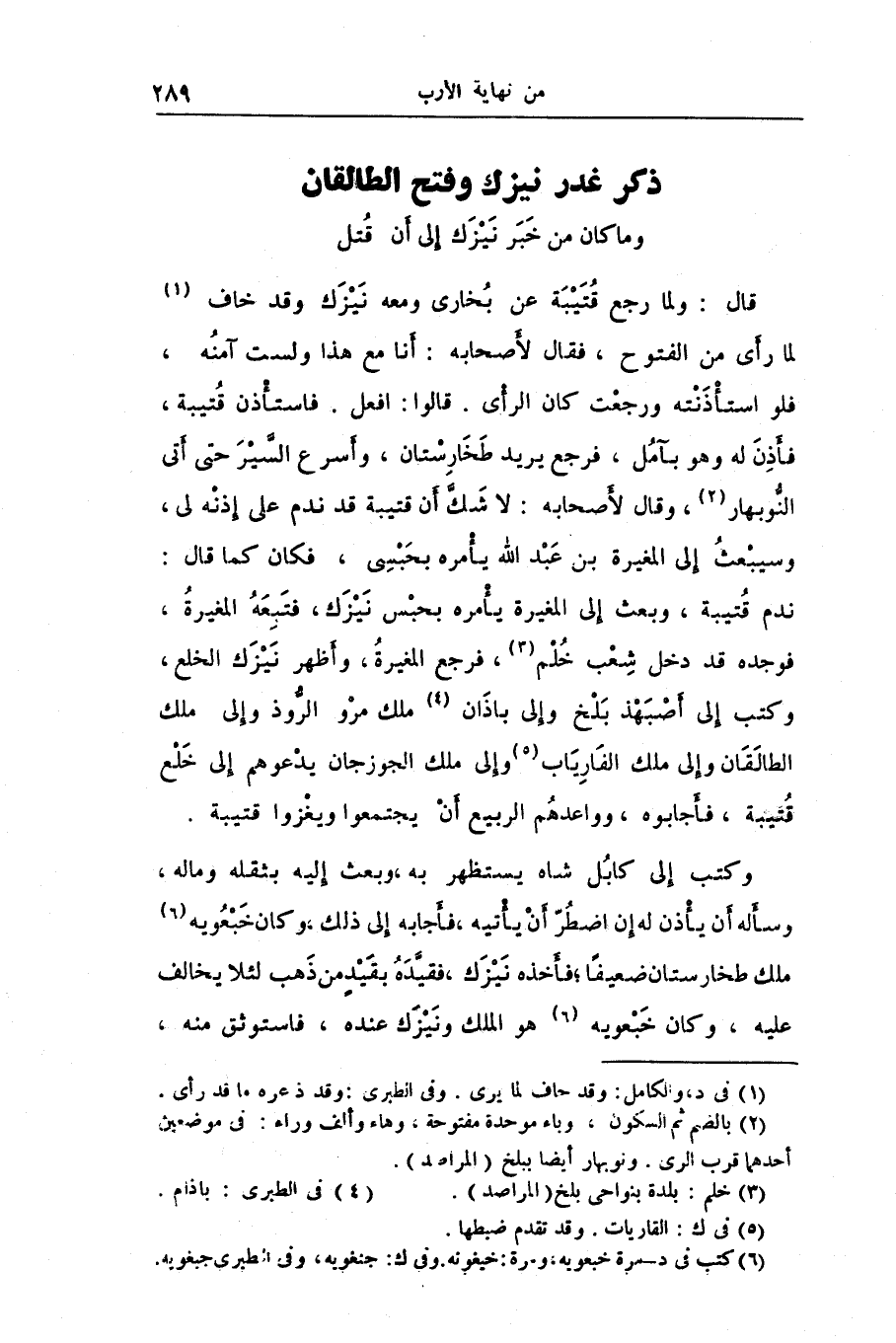 ندم قتيبة، وبعث إلى المغيرة يأمره بحبس نيزك، فتبعه المغيرة، فوجده قد دخل شعب خلم «3» ، فرجع المغيرة، وأظهر نيزك الخلع، وكتب إلى أصبهذ بلخ وإلى باذان «4» ملك مرو الرّوذ وإلى ملك الطالقان وإلى ملك الفارياب «5» وإلى ملك الجوزجان يدعوهم إلى خلع قتيبة، فأجابوه، وواعدهم الربيع أن يجتمعوا ويغزوا قتيبة.