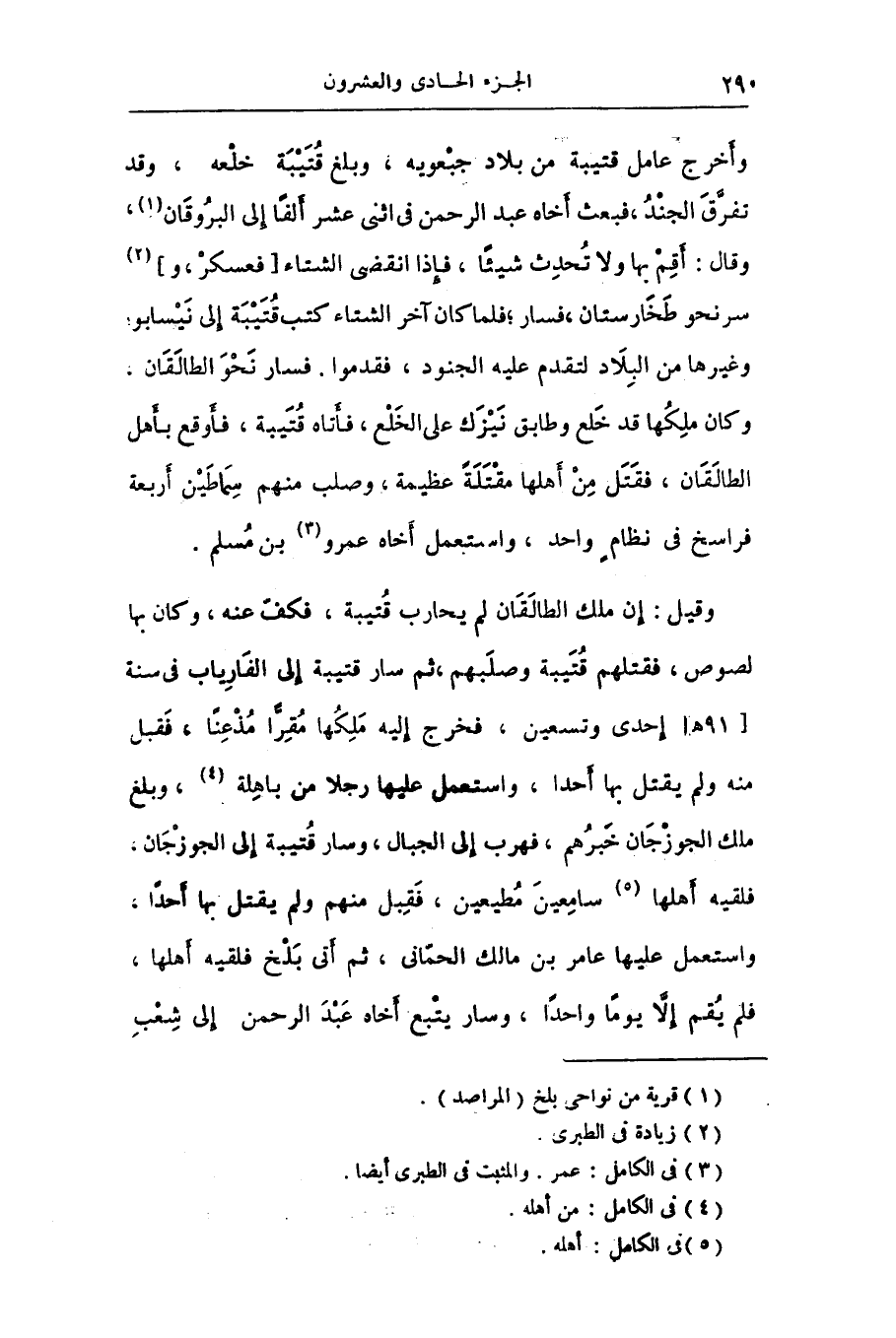 وقيل: إن ملك الطالقان لم يحارب قتيبة، فكفّ عنه، وكان بها لصوص، فقتلهم قتيبة وصلبهم، ثم سار قتيبة إلى الفارياب فى سنة [91 هـ] إحدى وتسعين، فخرج إليه ملكها مقرّا مذعنا، فقبل منه ولم يقتل بها أحدا، واستعمل عليها رجلا من باهلة «4» ، وبلغ ملك الجوزجان خبرهم، فهرب إلى الجبال، وسار قتيبة إلى الجوزجان، فلقيه أهلها «5» سامعين مطيعين، فقبل منهم ولم يقتل بها أحدا، واستعمل عليها عامر بن مالك الحمّانى، ثم أتى بلخ فلقيه أهلها، فلم يقم إلّا يوما واحدا، وسار يتبع أخاه عبد الرحمن إلى شعب