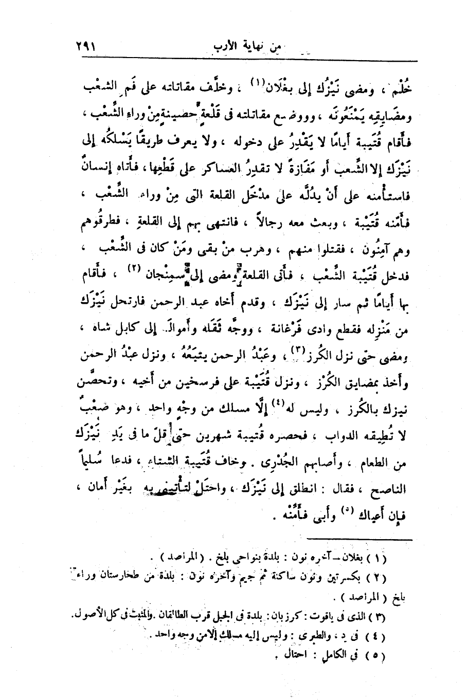 خلم، ومضى نيزك إلى بغلان «1» ، وخلّف مقاتلته على فم الشعب ومضايقه يمنعونه، ووضع مقاتلته فى قلعة حصينة من وراء الشّعب، فأقام قتيبة أياما لا يقدر على دخوله، ولا يعرف طريقا يسلكه إلى نيزك إلّا الشّعب أو مفازة لا تقدر العساكر على قطعها، فأتاه إنسان فاستأمنه على أن يدلّه على مدخل القلعة التى من وراء الشّعب، فأمّنه قتيبة، وبعث معه رجالا، فانتهى بهم إلى القلعة، فطرقوهم وهم آمنون، فقتلوا منهم، وهرب من بقى ومن كان فى الشّعب، فدخل قتيبة الشّعب، فأتى القلعة ومضى إلى سمنجان «2» ، فأقام بها أياما ثم سار إلى نيزك، وقدم أخاه عبد الرحمن فارتحل نيزك من منزله فقطع وادى فرغانة، ووجّه ثقله وأمواله إلى كابل شاه، ومضى حتى نزل الكرز «3» ، وعبد الرحمن يتبعه، ونزل عبد الرحمن وأخذ بمضايق الكرز، ونزل قتيبة على فرسخين من أخيه، وتحصّن نيزك بالكرز، وليس له «4» إلّا مسلك من وجه واحد، وهو صعب لا تطيقه الدواب، فحصره قتيبة شهرين حتى قلّ ما فى يد نيزك من الطعام، وأصابهم الجدرى. وخاف قتيبة الشتاء، فدعا سليما الناصح، فقال: انطلق إلى نيزك، واحتل لتأتينى به بغير أمان، فإن أعياك «5» وأبى فأمّنه.