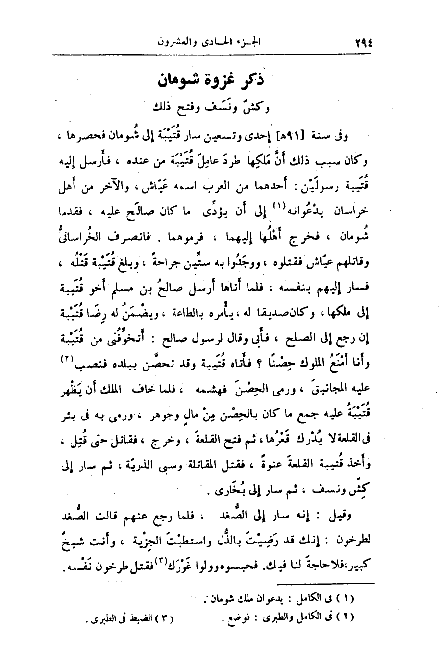 وفى سنة [91 هـ] إحدى وتسعين سار قتيبة إلى شومان فحصرها، وكان سبب ذلك أنّ ملكها طرد عامل قتيبة من عنده، فأرسل إليه قتيبة رسولين: أحدهما من العرب اسمه عيّاش، والآخر من أهل خراسان يدعوانه «1» إلى أن يؤدّى ما كان صالح عليه، فقدما شومان، فخرج أهلها إليهما، فرموهما. فانصرف الخراسانىّ وقاتلهم عيّاش فقتلوه، ووجدوا به ستّين جراحة، وبلغ قتيبة قتله، فسار إليهم بنفسه، فلما أتاها أرسل صالح بن مسلم أخو قتيبة إلى ملكها، وكان صديقا له، يأمره بالطاعة، ويضمن له رضا قتيبة إن رجع إلى الصلح، فأبى وقال لرسول صالح: أتخوّفنى من قتيبة وأنا أمنع الملوك حصنا؟ فأتاه قتيبة وقد تحصّن ببلده فنصب «2» عليه المجانيق، ورمى الحصن فهشمه، فلما خاف الملك أن يظهر قتيبة عليه جمع ما كان بالحصن من مال وجوهر، ورمى به فى بئر فى القلعة لا يدرك قعرها، ثم فتح القلعة، وخرج، فقاتل حتى قتل، وأخذ قتيبة القلعة عنوة، فقتل المقاتلة وسبى الذريّة، ثم سار إلى كشّ ونسف، ثم سار إلى بخارى.