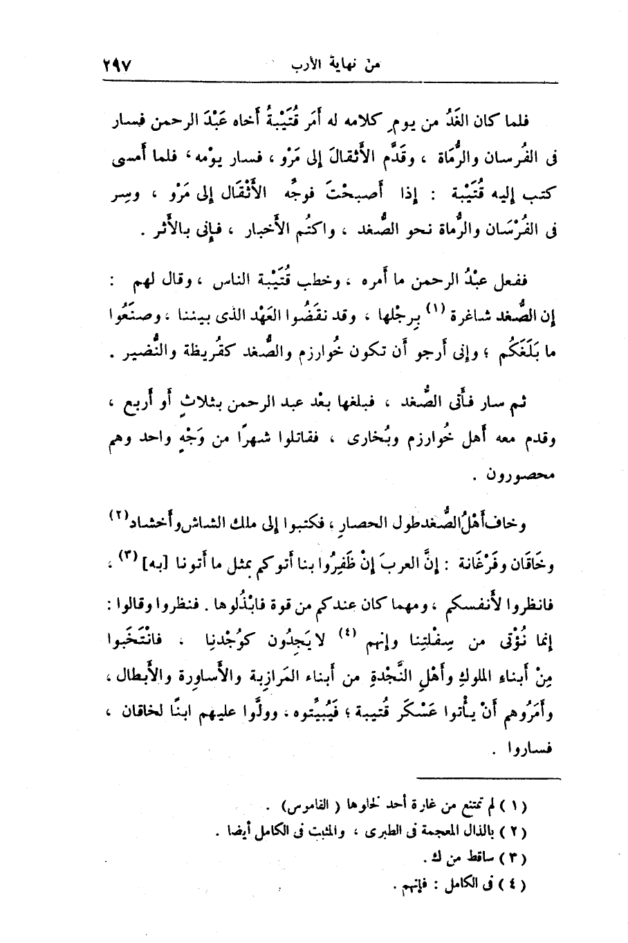 فلما كان الغد من يوم كلامه له أمر قتيبة أخاه عبد الرحمن فسار فى الفرسان والرّماة، وقدّم الأثقال إلى مرو، فسار يومه، فلما أمسى كتب إليه قتيبة: إذا أصبحت فوجّه الأثقال إلى مرو، وسر فى الفرسان والرّماة نحو الصّغد، واكتم الأخبار، فإنى بالأثر.