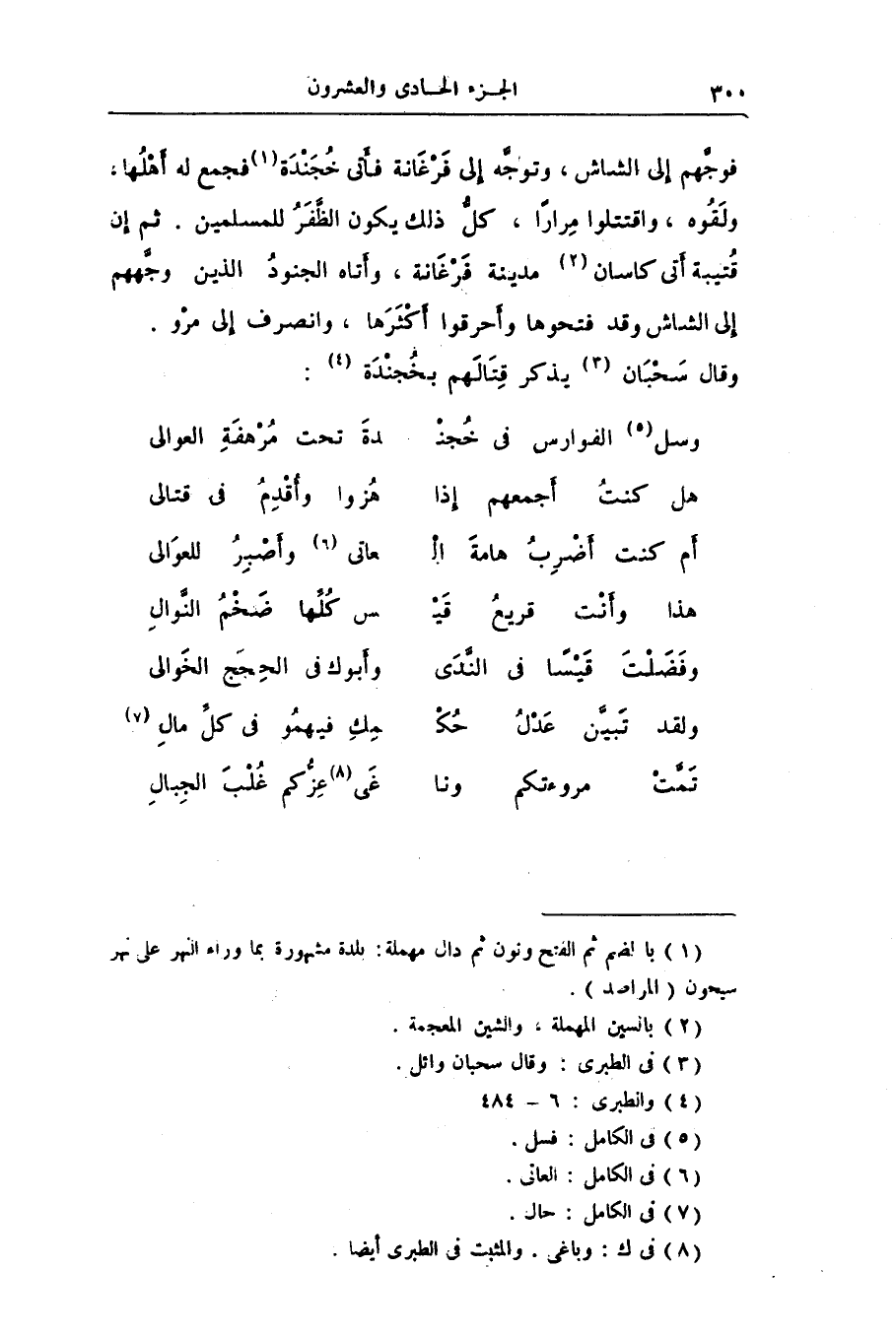 فوجّهم إلى الشاش، وتوجّه إلى فرغانة فأتى خجندة «1» فجمع له أهلها، ولقوه، واقتتلوا مرارا، كلّ ذلك يكون الظّفر للمسلمين. ثم إن قتيبة أتى كاسان «2» مدينة فرغانة، وأتاه الجنود الذين وجّههم إلى الشاش وقد فتحوها وأحرقوا أكثرها، وانصرف إلى مرو.
