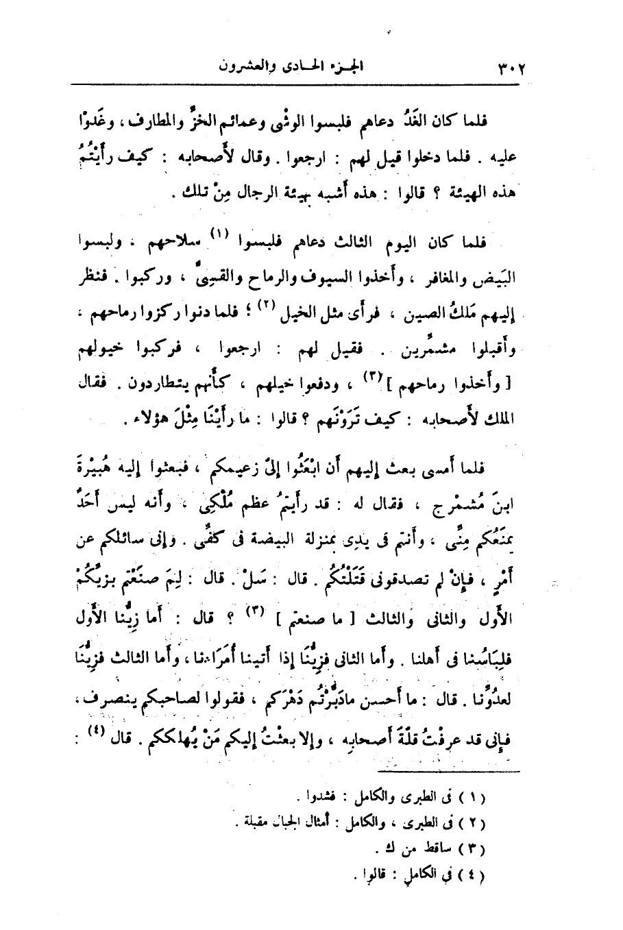 فلما أمسى بعث إليهم أن ابعثوا إلىّ زعيمكم، فبعثوا إليه هبيرة ابن مشمرج، فقال له: قد رأيتم عظم ملكى، وأنه ليس أحد يمنعكم منّى، وأنتم فى يدى بمنزلة البيضة فى كفّى. وإنى سائلكم عن أمر، فإن لم تصدقونى قتلتكم. قال: سل. قال: لم صنعتم بزيّكم الأول والثانى والثالث [ما صنعتم] «4» ؟ قال: أما زيّنا الأول فلباسنا فى أهلنا. وأما الثانى فزيّنا إذا أتينا أمراءنا، وأما الثالث فزيّنا لعدوّنا. قال: ما أحسن ما دبّرتم دهركم، فقولوا لصاحبكم ينصرف، فإنى قد عرفت قلّة أصحابه، وإلا بعثت إليكم من يهلككم. قال «5» :