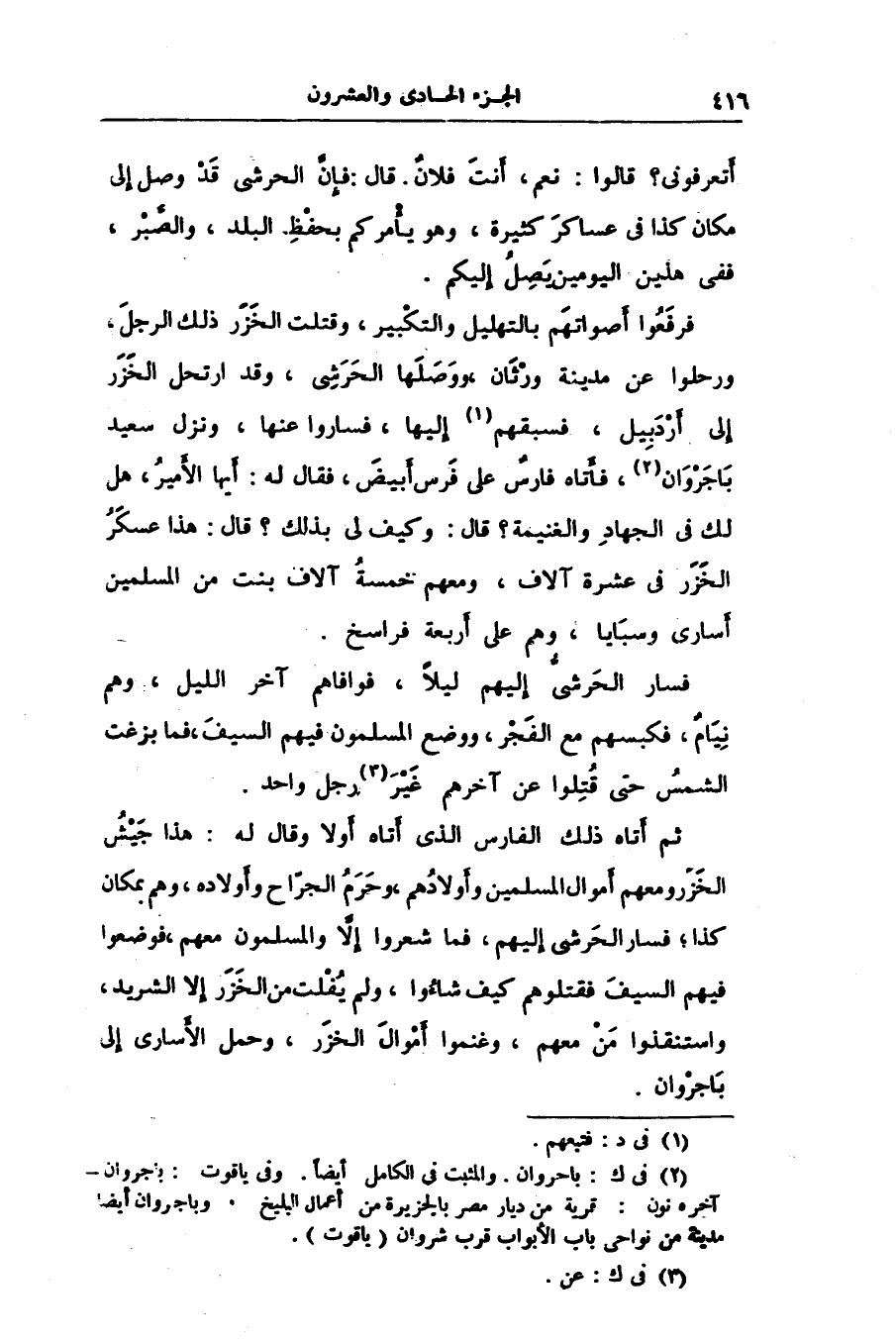 ثم أتاه ذلك الفارس الذى أتاه أولا وقال له: هذا جيش الخزر ومعهم أموال المسلمين وأولادهم، وحرم الجرّاح وأولاده، وهم بمكان كذا؛ فسار الحرشى إليهم، فما شعروا إلّا والمسلمون معهم، فوضعوا فيهم السيف فقتلوهم كيف شاءوا، ولم يفلت من الخزر إلا الشريد، واستنقذوا من معهم، وغنموا أموال الخزر، وحمل الأسارى إلى باجروان.