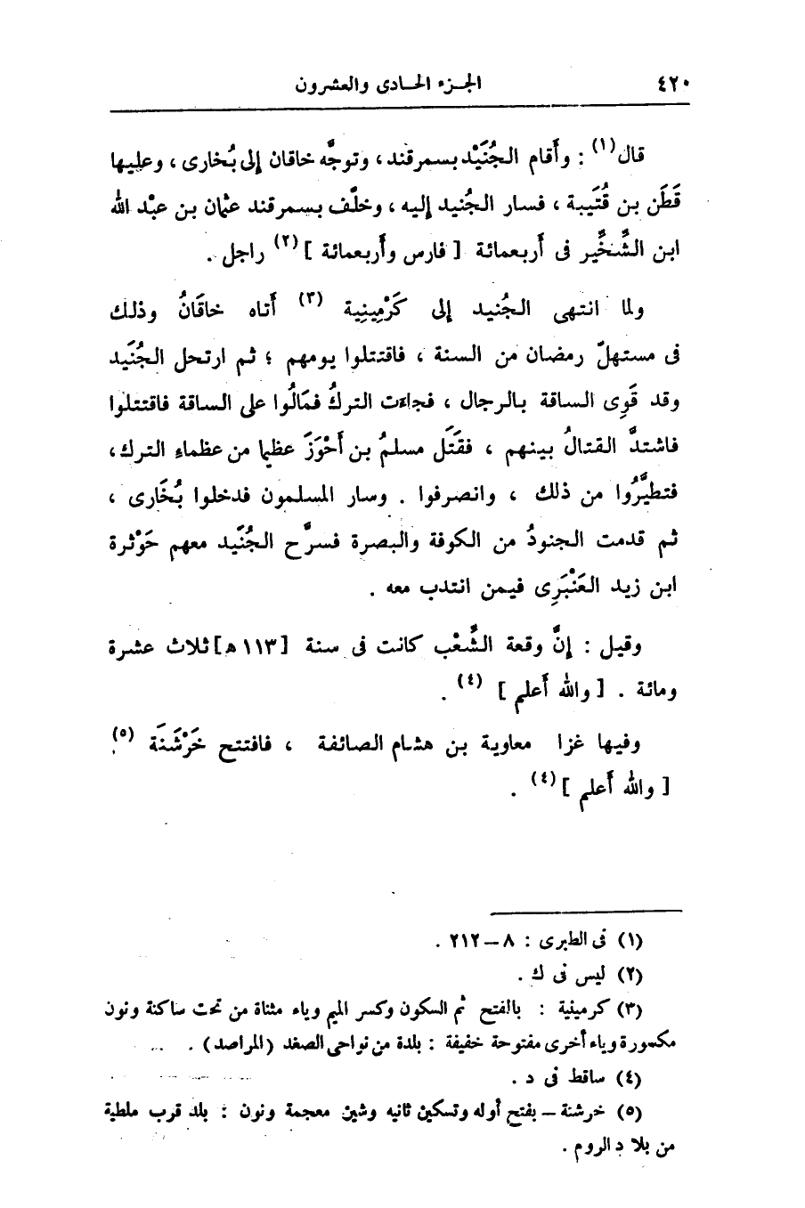 ولما انتهى الجنيد إلى كرمينية «3» أتاه خاقان وذلك فى مستهلّ رمضان من السنة، فاقتتلوا يومهم؛ ثم ارتحل الجنيد وقد قوى الساقة بالرجال، فجاءت الترك فمالوا على الساقة فاقتتلوا فاشتدّ القتال بينهم، فقتل مسلم بن أحوز عظيما من عظماء الترك، فتطيّروا من ذلك، وانصرفوا. وسار المسلمون فدخلوا بخارى، ثم قدمت الجنود من الكوفة والبصرة فسرّح الجنيد معهم حوثرة ابن زيد العنبرى فيمن انتدب معه.