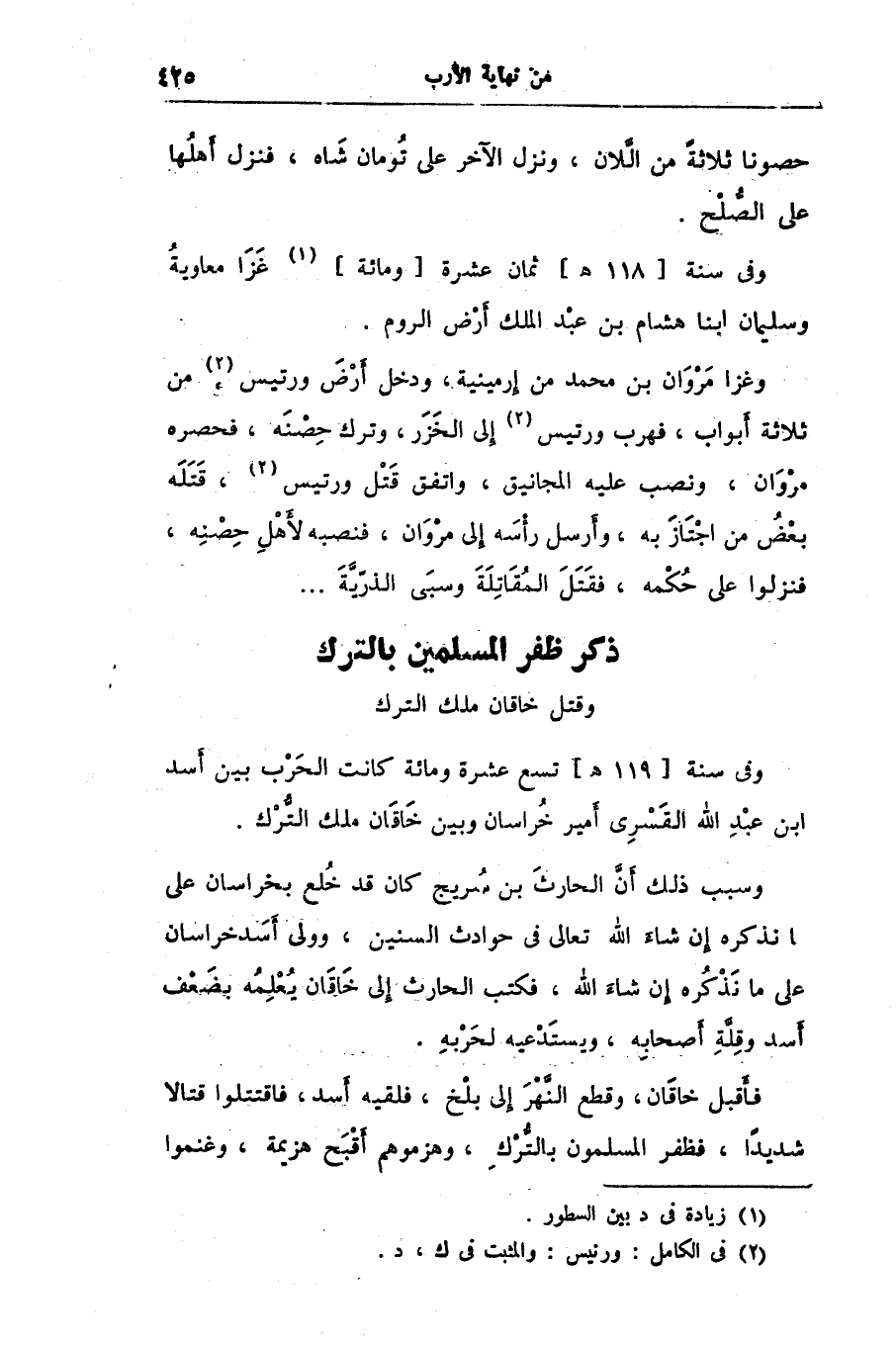 وفى سنة [119 هـ] تسع عشرة ومائة كانت الحرب بين أسد ابن عبد الله القسرى أمير خراسان وبين خاقان ملك التّرك.