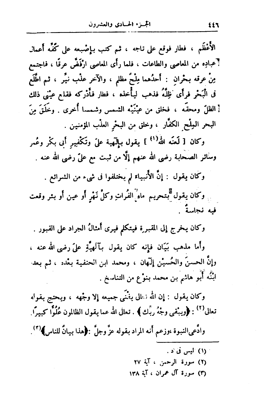 وكان يقول: إن الله تعالى يفنى جميعه إلا وجهه، ويحتج بقوله تعالى «2» : وَيَبْقى وَجْهُ رَبِّكَ