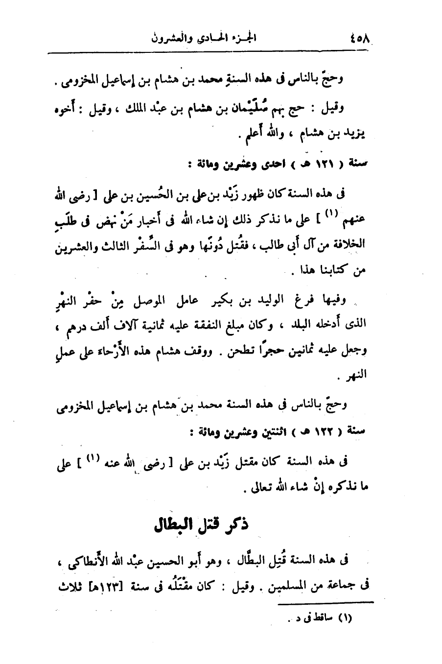 فى هذه السنة كان مقتل زيد بن على [رضى الله عنه «2» ] على ما نذكره إن شاء الله تعالى.