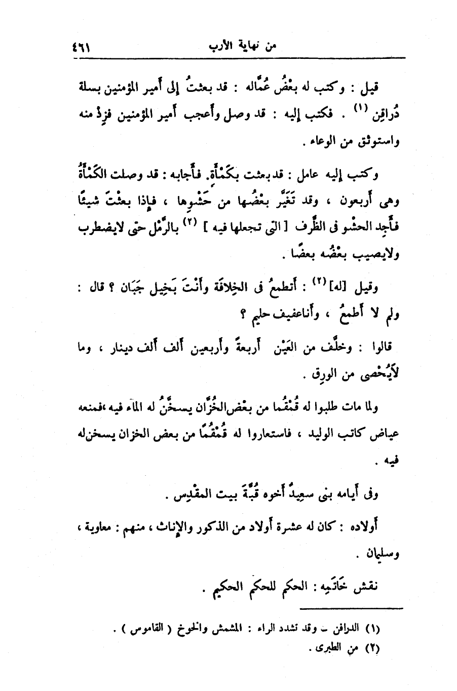 وكتب إليه عامل: قد بعثت بكمأة. فأجابه: قد وصلت الكمأة وهى أربعون، وقد تغيّر بعضها من حشوها، فإذا بعثت شيئا فأجد الحشو فى الظّرف [التى تجعلها فيه] «2» بالرّمل حتى لا يضطرب ولا يصيب بعضه بعضا.