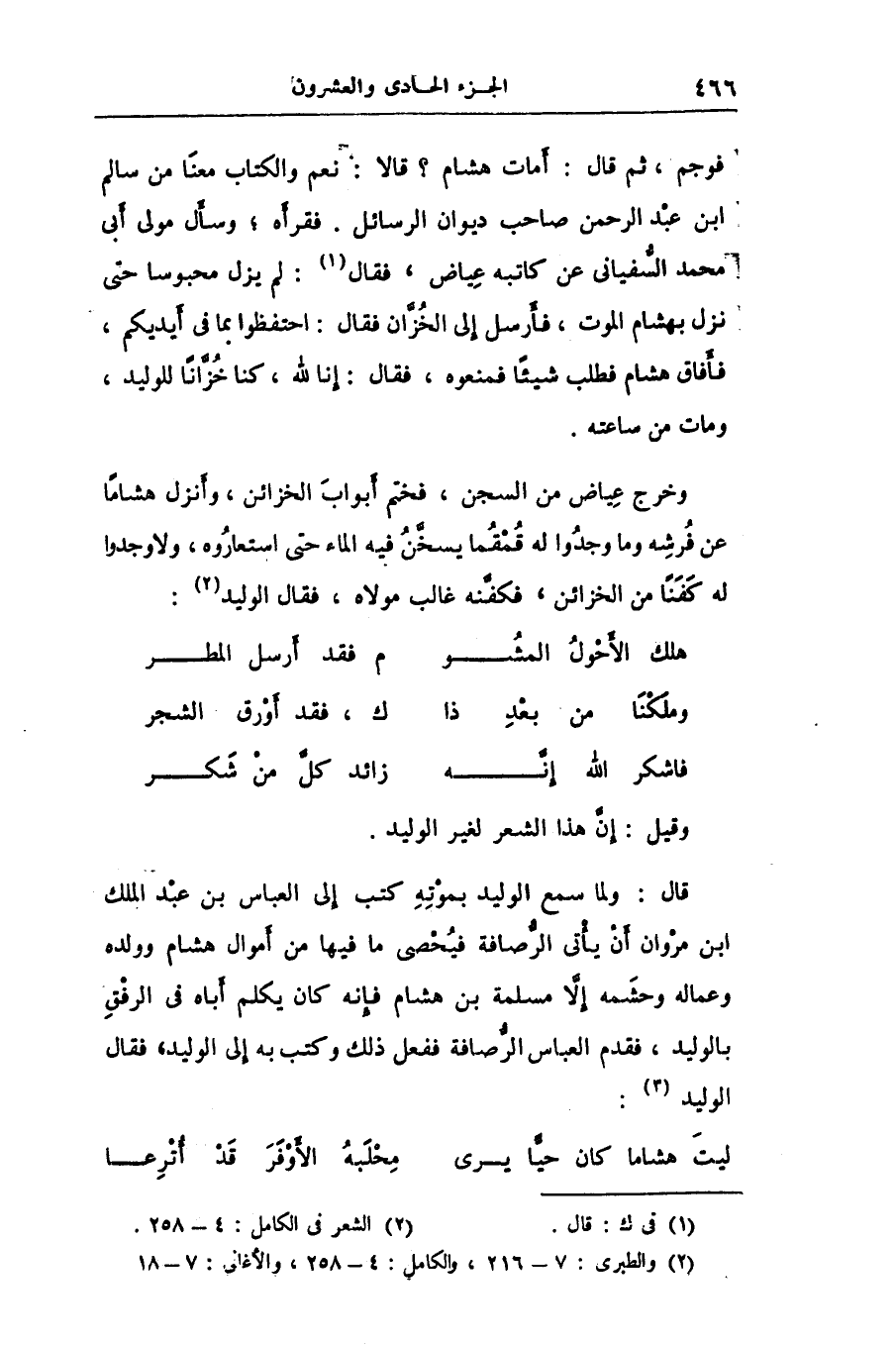 فوجم، ثم قال: أمات هشام؟ قالا: نعم والكتاب معنا من سالم ابن عبد الرحمن صاحب ديوان الرسائل. فقرأه؛ وسأل مولى أبى محمد السّفيانى عن كاتبه عياض، فقال «1» : لم يزل محبوسا حتى نزل بهشام الموت، فأرسل إلى الخزّان فقال: احتفظوا بما فى أيديكم، فأفاق هشام فطلب شيئا فمنعوه، فقال: إنا لله، كنا خزّانا للوليد، ومات من ساعته.