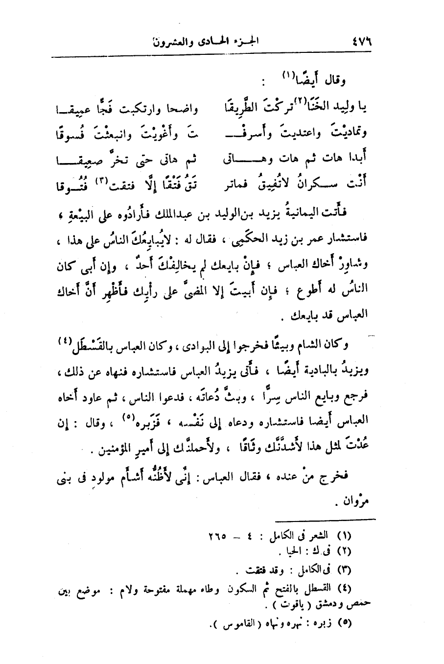 وكان الشام وبيئا فخرجوا إلى البوادى، وكان العباس بالقسطل «4» ويزيد بالبادية أيضا، فأتى يزيد العباس فاستشاره فنهاه عن ذلك، فرجع وبايع الناس سرّا، وبثّ دعاته، فدعوا الناس، ثم عاود أخاه العباس أيضا فاستشاره ودعاه إلى نفسه، فزبره «5» ، وقال: إن عدت لمثل هذا لأشدّنّك وثاقا، ولأحملنّك إلى أمير المؤمنين.