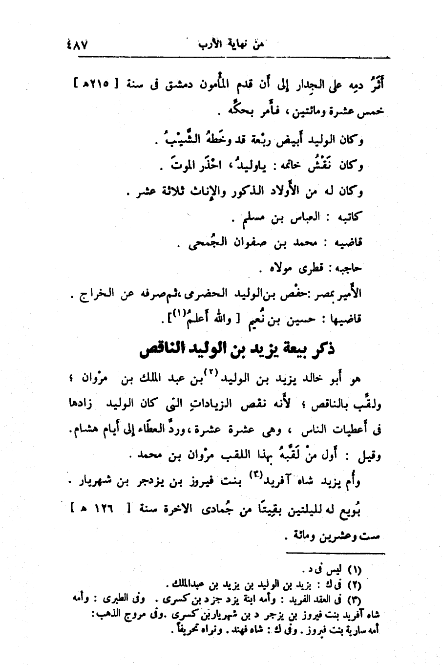 هو أبو خالد يزيد بن الوليد «2» بن عبد الملك بن مروان؛ ولقّب بالناقص؛ لأنه نقص الزيادات التى كان الوليد زادها فى أعطيات الناس، وهى عشرة عشرة، وردّ العطاء إلى أيام هشام.
