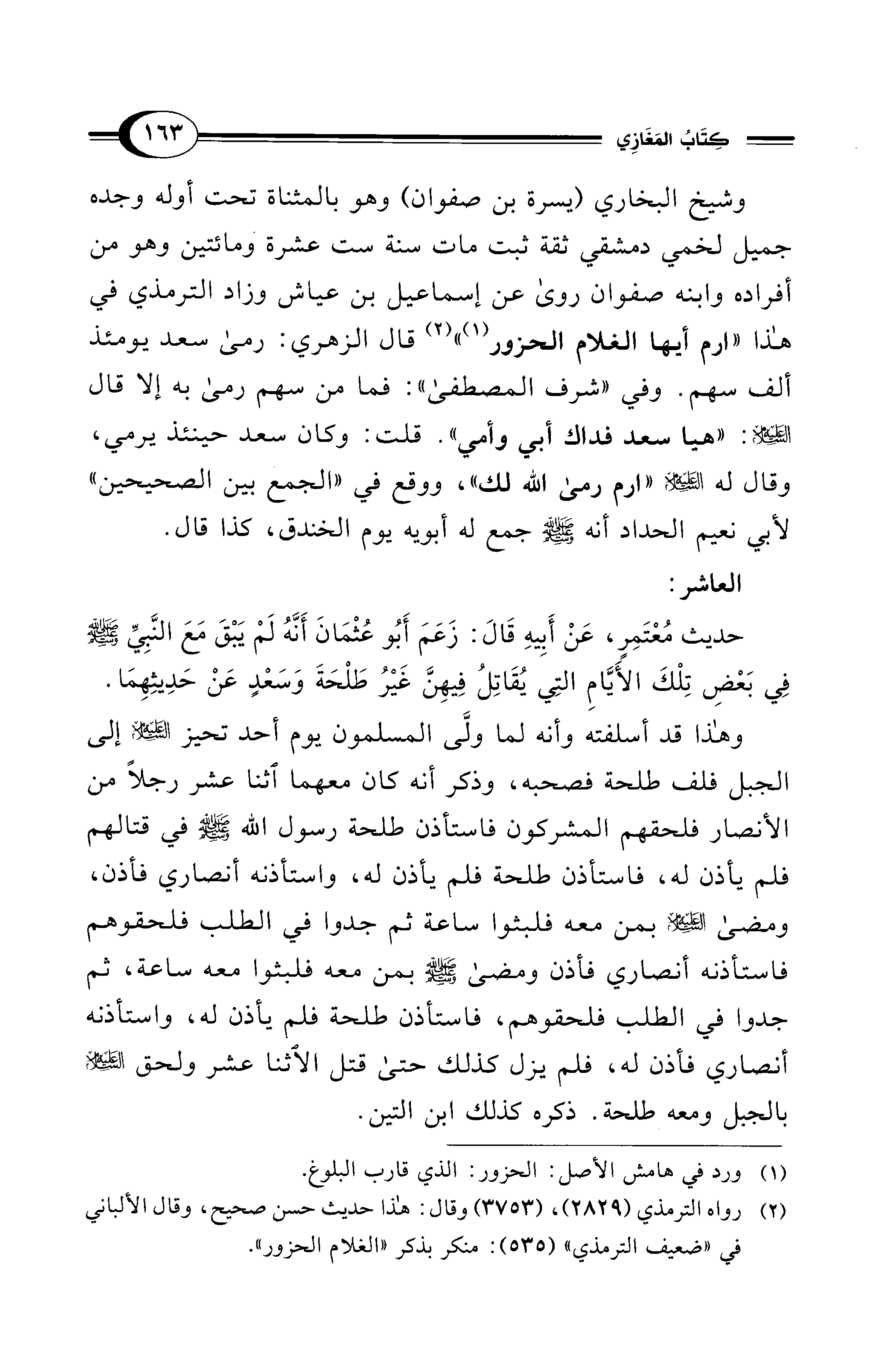 حديث مُعْتَمِرٍ، عَنْ أَبِيهِ قَالَ: زَعَمَ أَبُو عُثْمَانَ أَنَّهُ لَمْ يَبْقَ مَعَ النَّبِيِّ - صلى الله عليه وسلم - في بَعْضِ تِلْكَ الأَيَّامِ التِي يُقَاتِلُ فِيهِنَّ غَيْرُ طَلْحَةَ وَسَعْدٍ عَنْ حَدِيثِهِمَا.