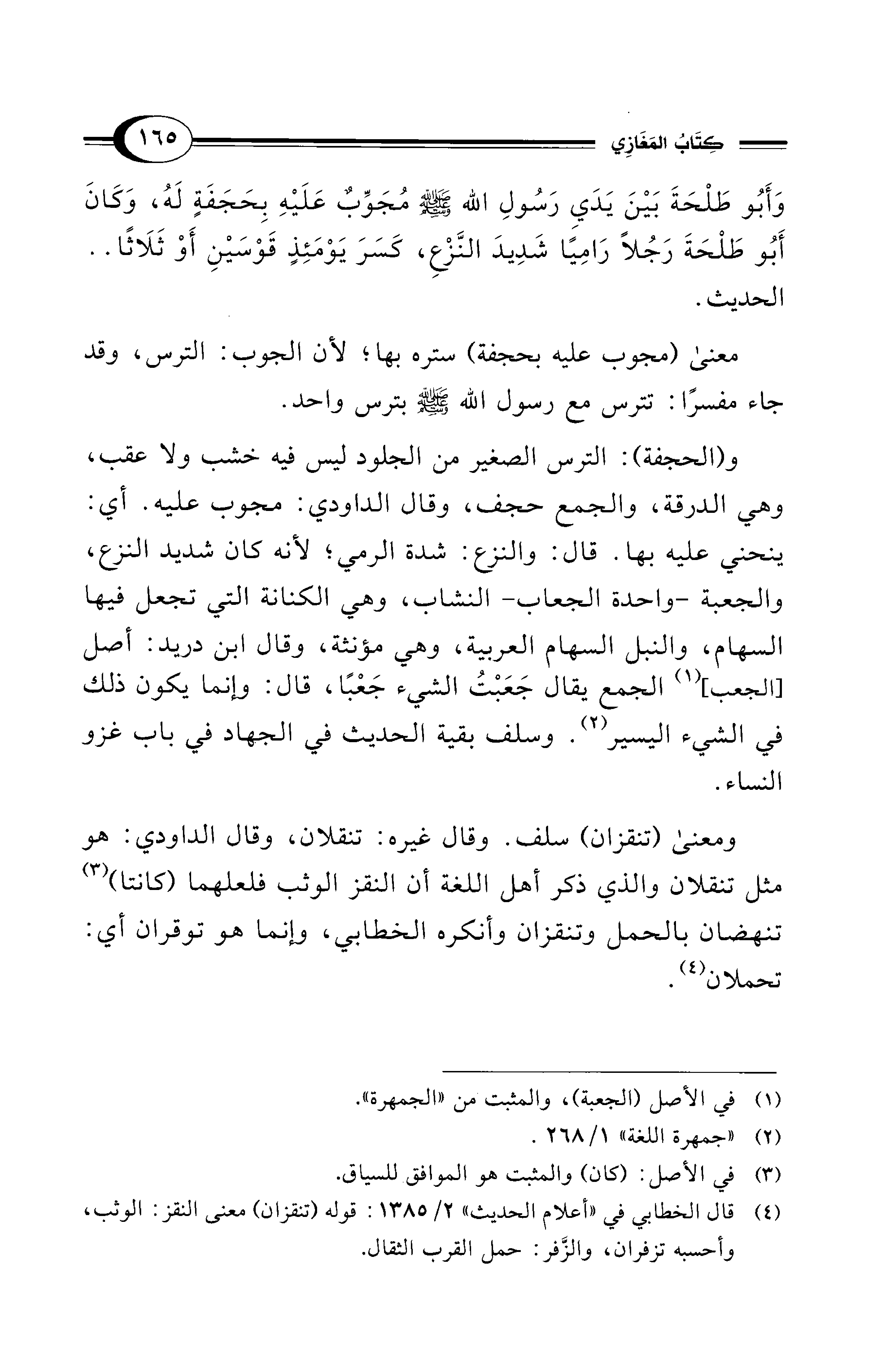 وَأَبُو طَلْحَةَ بَيْنَ يَدَيِ رَسُولِ الله - صلى الله عليه وسلم - مُجَوِّبٌ عَلَيْهِ بِحَجَفَةٍ لَهُ، وَكَانَ أَبُو طَلْحَةَ رَجُلاً رَامِيًا شَدِيدَ النَّزْعِ، كَسَرَ يَوْمَئِذٍ قَوْسَيْنِ أَوْ ثَلَاثًا ..