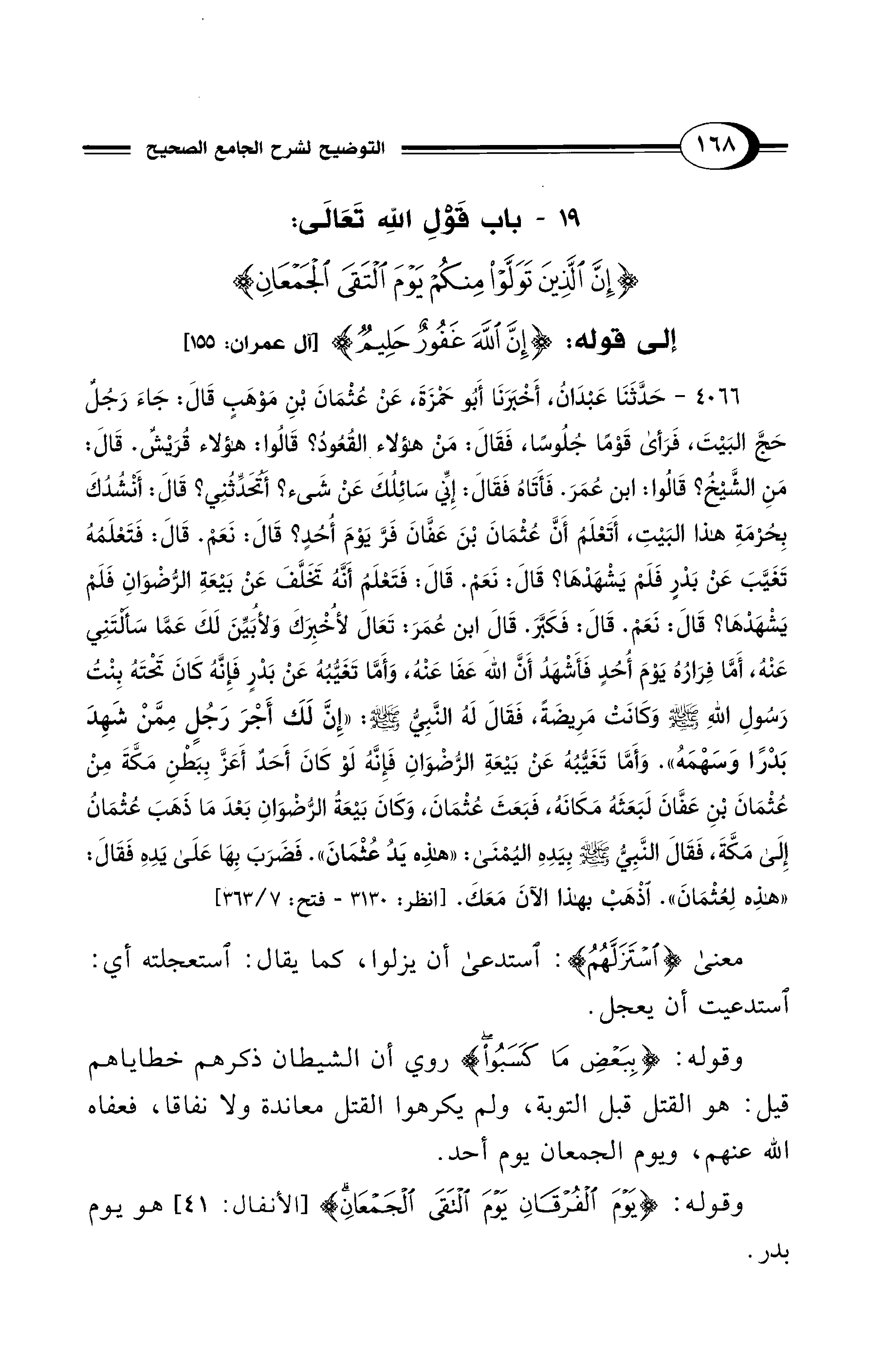 19 - باب قَوْلِ اللَّهِ تَعَالَى: {إِنَّ الَّذِينَ تَوَلَّوْا مِنْكُمْ يَوْمَ الْتَقَى الْجَمْعَانِ} إلى قوله: {إِنَّ اللَّهَ غَفُورٌ حَلِيمٌ} [آل عمران:155]