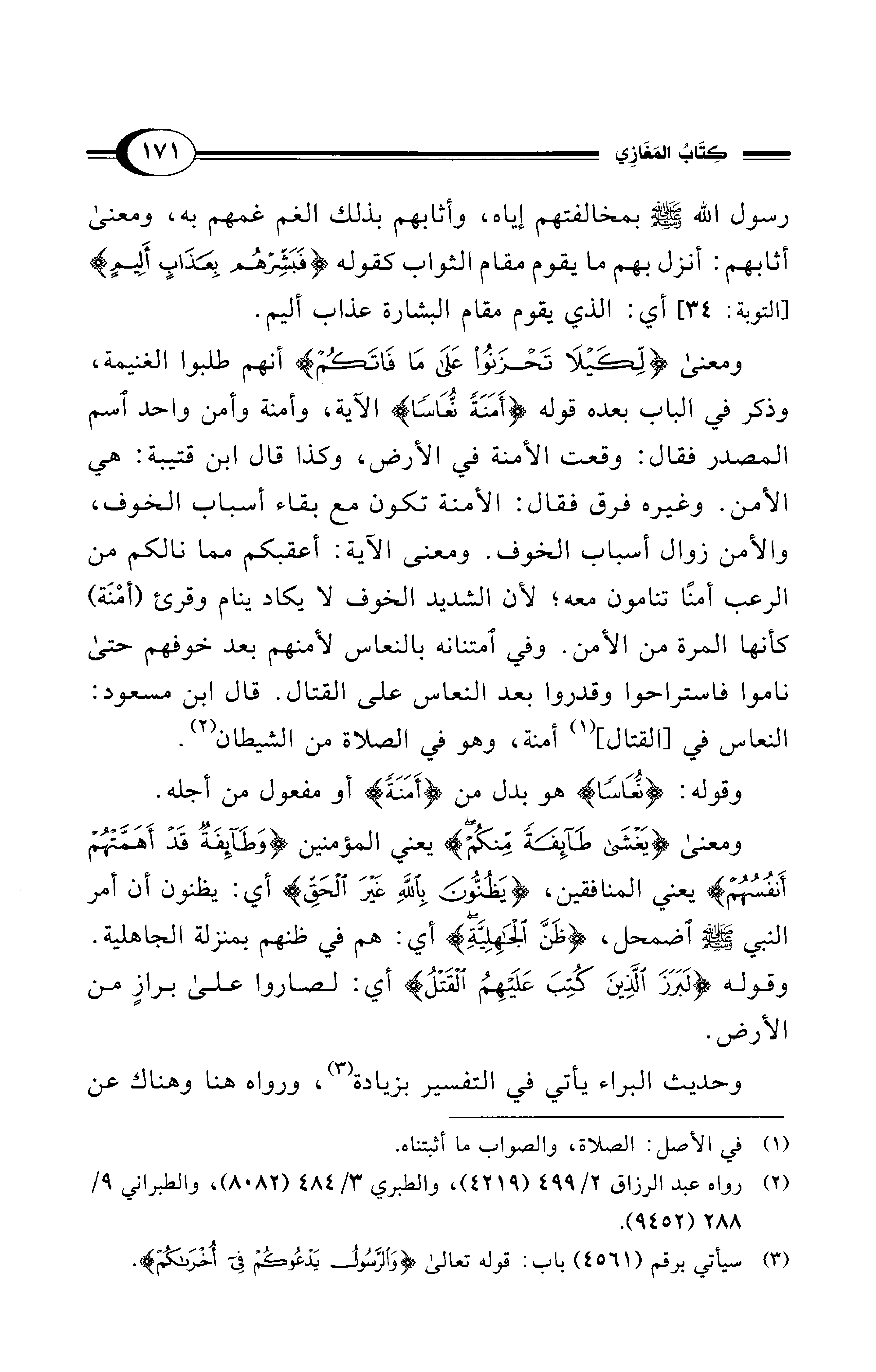 ومعنى {لِكَيْلَا تَحْزَنُوا عَلَى مَا فَاتَكُمْ} أنهم طلبوا الغنيمة, وذكر في الباب بعده قوله {أَمَنَةً نُعَاسًا} الآية، وأمنة وأمن واحد اسم المصدر فقال: وقعت الأمنة في الأرض، وكذا قال ابن قتيبة: هي الأمن. وغيره فرق فقال: الأمنة تكون مع بقاء أسباب الخوف، والأمن زوال أسباب الخوف. ومعنى الآية: أعقبكم بما نالكم من الرعب أمنًا تنامون معه؛ لأن الشديد الخوف لا يكاد ينام وقرئ (أمْنَة) كأنها المرة من الأمن. وفي امتنانه بالنعاس لأمنهم بعد خوفهم حتى ناموا فاستراحوا وقدروا بعد النعاس على القتال. قال ابن مسعود: النعاس في [القتال] (¬1) أمنة، وهو في الصلاة من الشيطان (¬2).