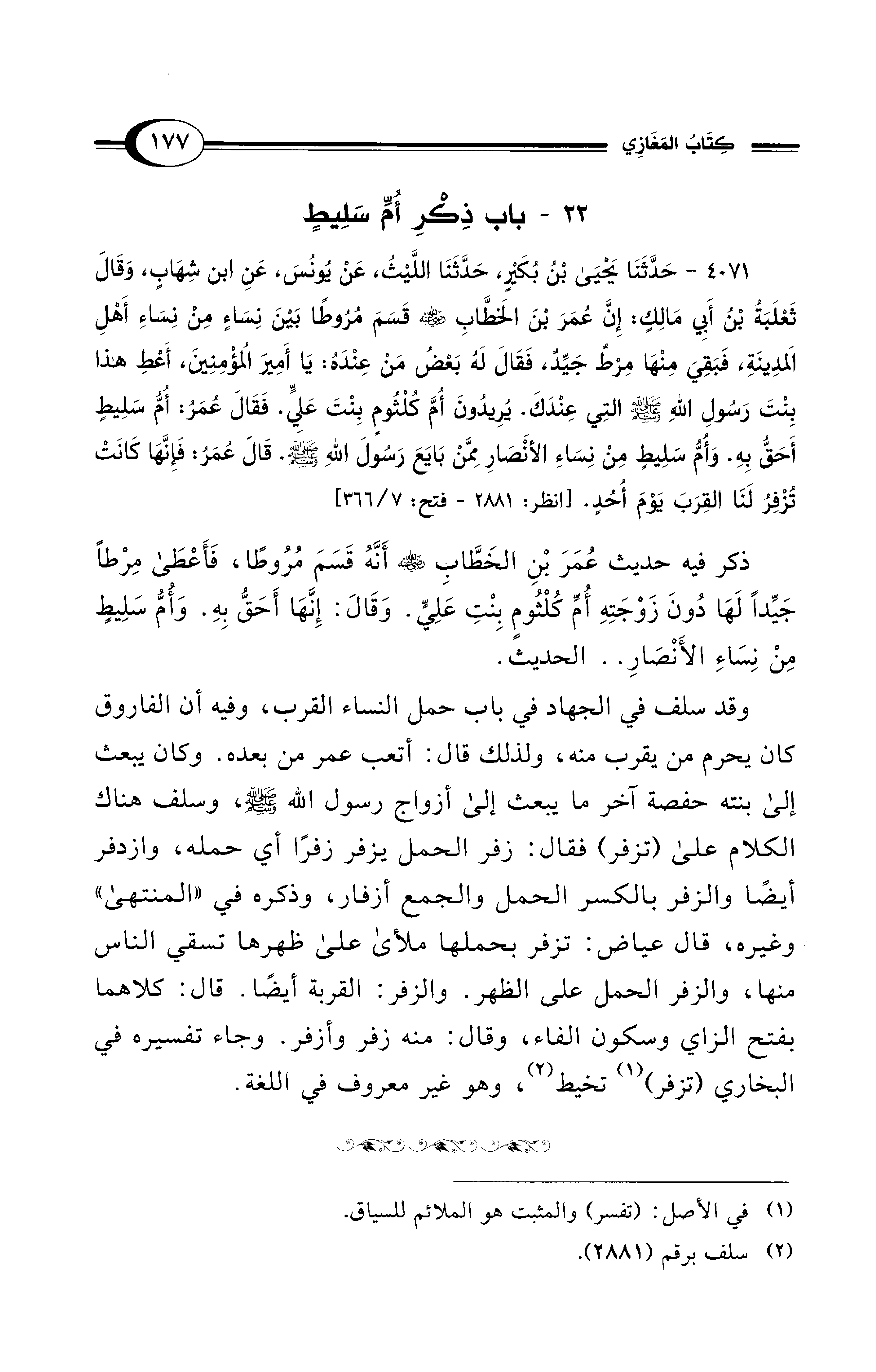 4071 - حَدَّثَنَا يَحْيَى بْنُ بُكَيْرٍ, حَدَّثَنَا اللَّيْثُ, عَنْ يُونُسَ, عَنِ ابْنِ شِهَابٍ, وَقَالَ ثَعْلَبَةُ بْنُ أَبِي مَالِكٍ: إِنَّ عُمَرَ بْنَ الْخَطَّابِ - رضي الله عنه - قَسَمَ مُرُوطًا بَيْنَ نِسَاءٍ مِنْ نِسَاءِ أَهْلِ الْمَدِينَةِ، فَبَقِىَ مِنْهَا مِرْطٌ جَيِّدٌ، فَقَالَ لَهُ بَعْضُ مَنْ عِنْدَه: يَا أَمِيرَ الْمُؤْمِنِينَ, أَعْطِ هَذَا بِنْتَ رَسُولِ اللَّهِ - صلى الله عليه وسلم - الَّتِى عِنْدَكَ. يُرِيدُونَ أُمَّ كُلْثُومٍ بِنْتَ عَلِيٍّ. فَقَالَ عُمَر: أُمُّ سَلِيطٍ أَحَقُّ بِهِ. وَأُمُّ سَلِيطٍ مِنْ نِسَاءِ الأَنْصَارِ مِمَّنْ بَايَعَ رَسُولَ اللَّهِ - صلى الله عليه وسلم -. قَالَ عُمَرُ: فَإِنَّهَا كَانَتْ تُزْفِرُ لَنَا الْقِرَبَ يَوْمَ أُحُدٍ. [انظر: 2881 - فتح: 7/ 366]