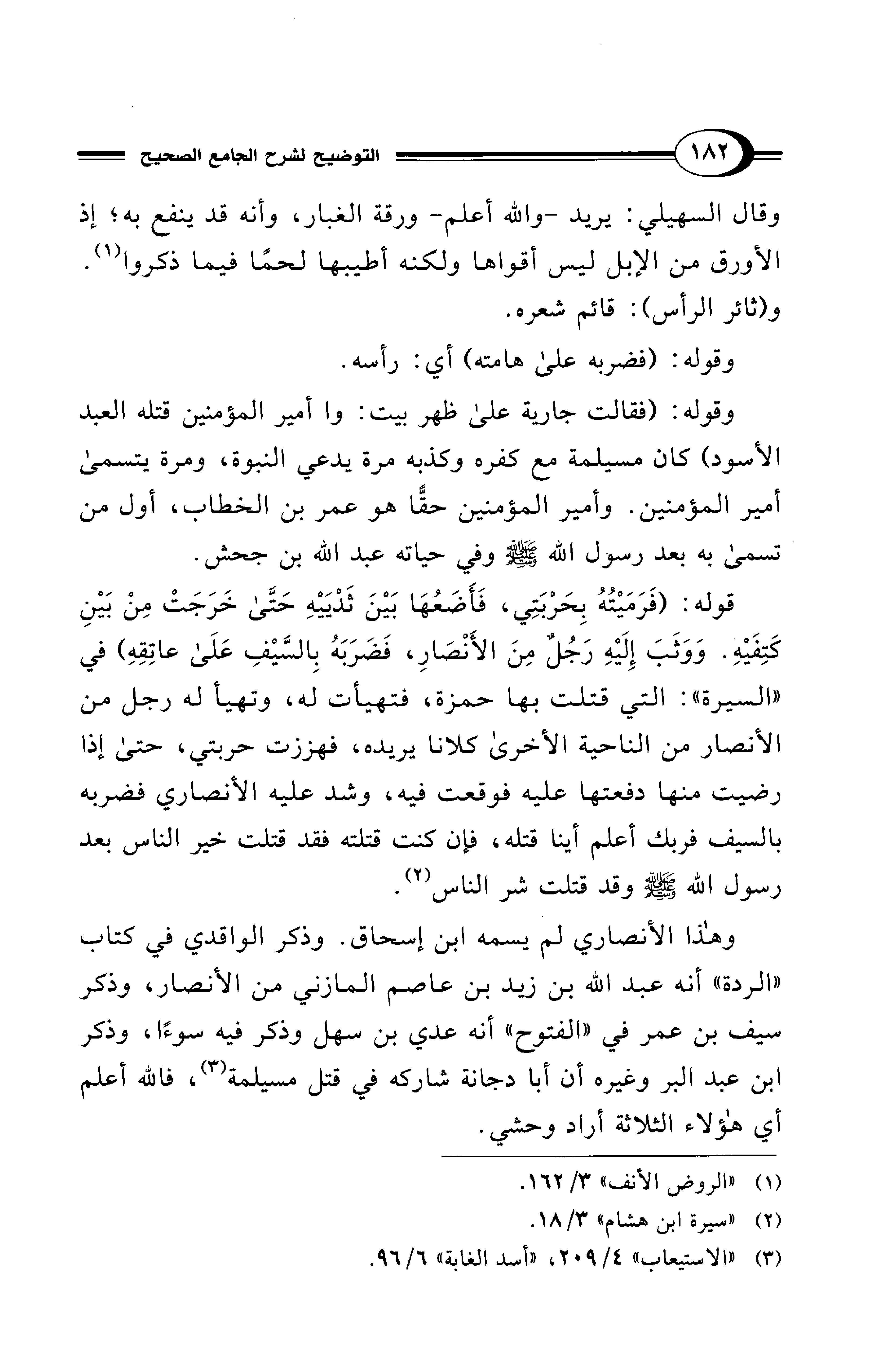 وهذا الأنصاري لم يسمه ابن إسحاق. وذكر الواقدي في كتاب "الردة" أنه عبد الله بن زيد بن عاصم المازني من الأنصار، وذكر سيف بن عمر في "الفتوح" أنه عدي بن سهل وذكر فيه سوءًا، وذكر ابن عبد البر وغيره أن أبا دجانة شاركه في قتل مسيلمة (¬3)، فالله أعلم أي هؤلاء الثلاثة أراد وحشي.