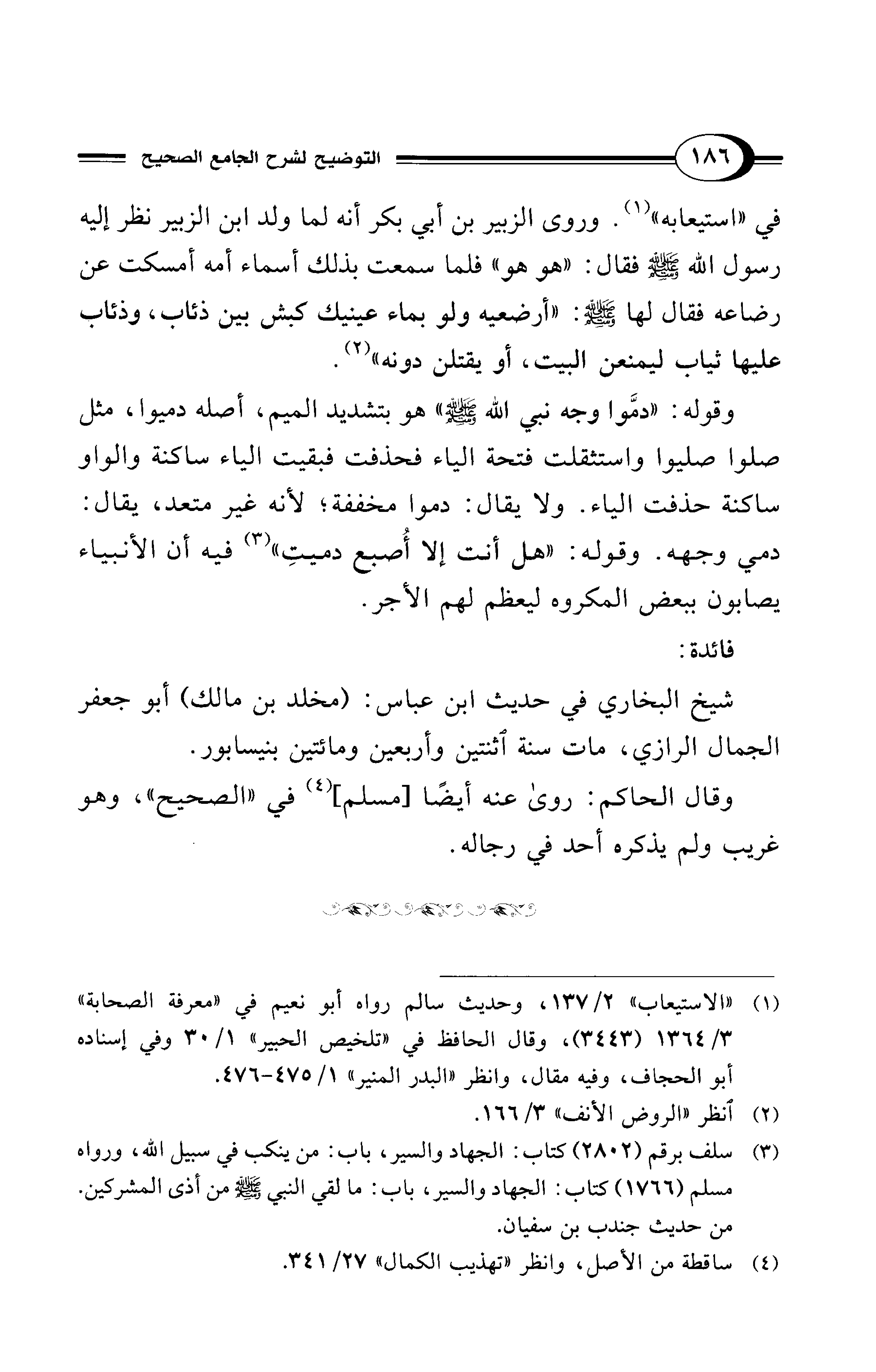 في "استيعابه" (¬1). وروى الزبير بن أبي بكر أنه لما ولد ابن الزبير نظر إليه رسول الله - صلى الله عليه وسلم - فقال: "هو هو" فلما سمعت بذلك أسماء أمه أمسكت عن رضاعه فقال لها - صلى الله عليه وسلم -: "أرضعيه ولو بماء عينيك كبش بين ذئاب، وذئاب عليها ثياب ليمنعن البيت، أو يقتلن دونه" (¬2).
