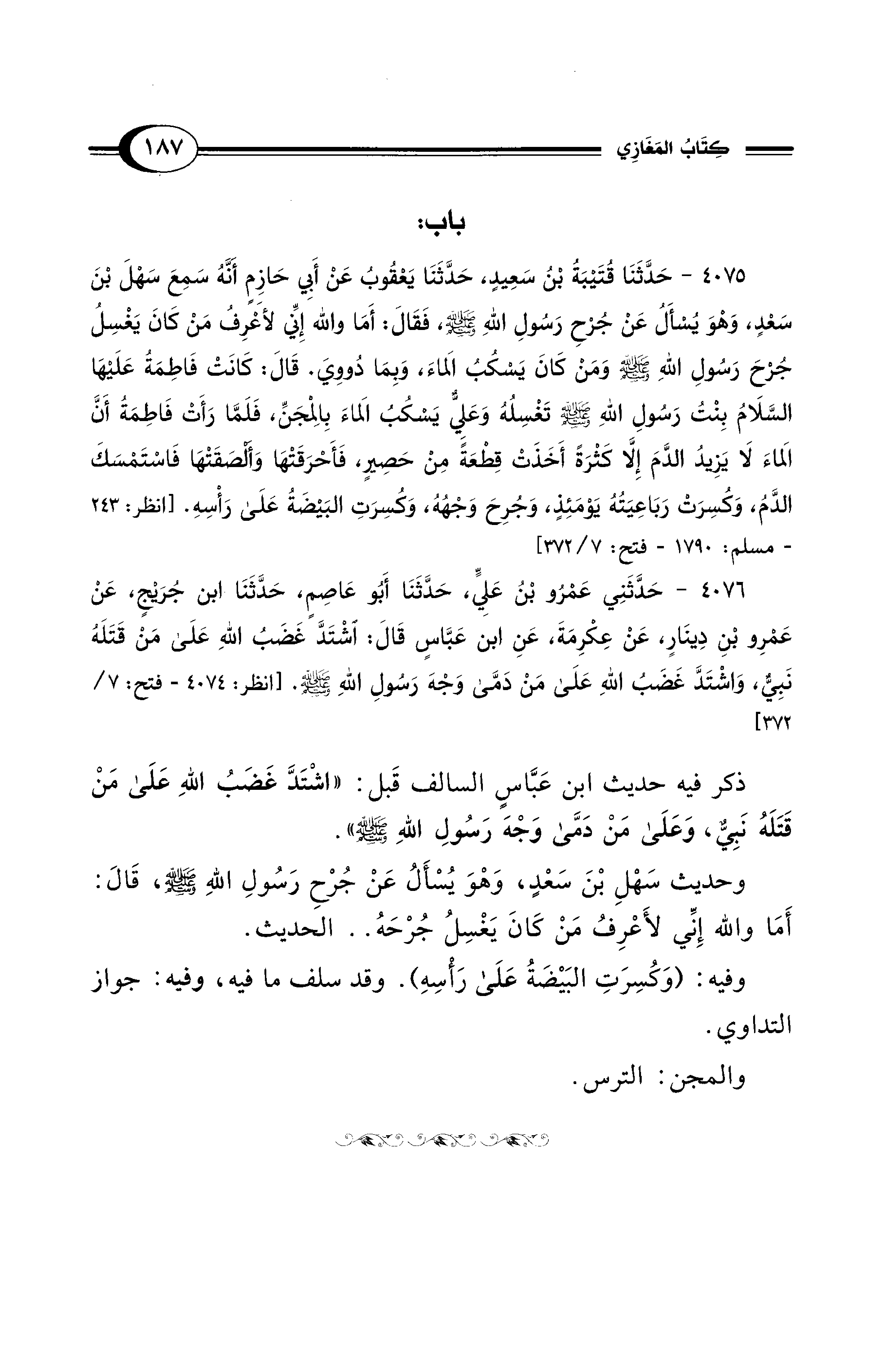 4075 - حَدَّثَنَا قُتَيْبَةُ بْنُ سَعِيدٍ, حَدَّثَنَا يَعْقُوبُ عَنْ أَبِي حَازِمٍ أَنَّهُ سَمِعَ سَهْلَ بْنَ سَعْدٍ، وَهْوَ يُسْأَلُ عَنْ جُرْحِ رَسُولِ اللَّهِ - صلى الله عليه وسلم - فَقَالَ: أَمَا وَاللَّهِ إِنِّي لأَعْرِفُ مَنْ كَانَ يَغْسِلُ جُرْحَ رَسُولِ اللَّهِ - صلى الله عليه وسلم - وَمَنْ كَانَ يَسْكُبُ الْمَاء, وَبِمَا دُووِىَ. قَال: كَانَتْ فَاطِمَةُ عَلَيْهَا السَّلاَمُ - بِنْتُ رَسُولِ اللَّهِ - صلى الله عليه وسلم - تَغْسِلُهُ وَعَلِيٌّ يَسْكُبُ الْمَاءَ بِالْمِجَنِّ، فَلَمَّا رَأَتْ فَاطِمَةُ أَنَّ الْمَاءَ لاَ يَزِيدُ الدَّمَ إِلاَّ كَثْرَةً أَخَذَتْ قِطْعَةً مِنْ حَصِيرٍ، فَأَحْرَقَتْهَا وَأَلْصَقَتْهَا فَاسْتَمْسَكَ الدَّمُ، وَكُسِرَتْ رَبَاعِيَتُهُ يَوْمَئِذٍ، وَجُرِحَ وَجْهُهُ، وَكُسِرَتِ الْبَيْضَةُ عَلَى رَأْسِهِ. [انظر: 243
