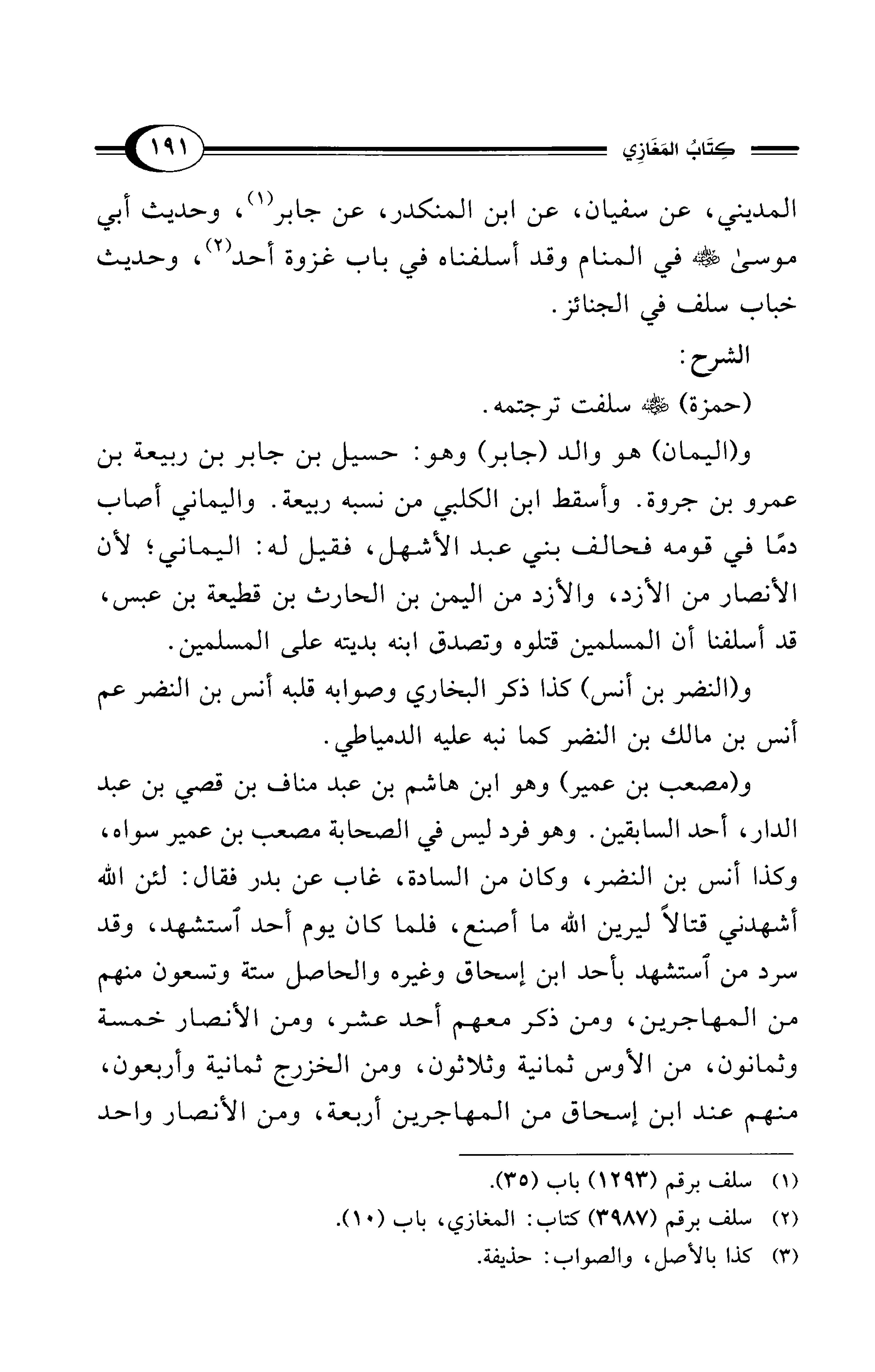 و (النضر بن أنس) كذا ذكر البخاري وصوابه قلبه أنس بن النضر عم أنس بن مالك بن النضر كما نبه عليه الدمياطي.