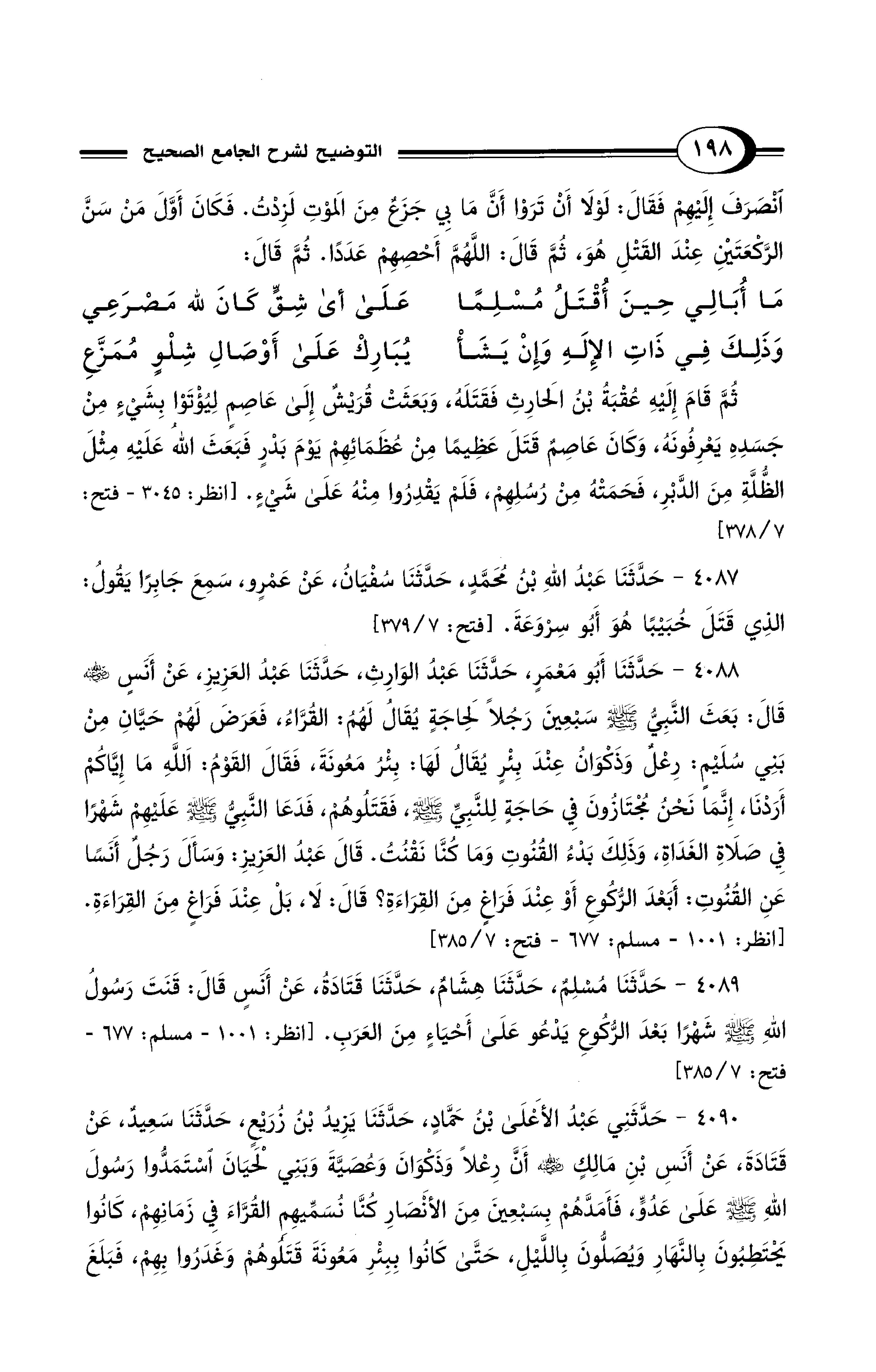 4090 - حَدَّثَنِي عَبْدُ الأَعْلَى بْنُ حَمَّادٍ, حَدَّثَنَا يَزِيدُ بْنُ زُرَيْعٍ, حَدَّثَنَا سَعِيدٌ, عَنْ قَتَادَةَ, عَنْ أَنَسِ بْنِ مَالِكٍ - رضي الله عنه - أَنَّ رِعْلاً وَذَكْوَانَ وَعُصَيَّةَ وَبَنِى لَحْيَانَ اسْتَمَدُّوا رَسُولَ اللَّهِ - صلى الله عليه وسلم - عَلَى عَدُوٍّ، فَأَمَدَّهُمْ بِسَبْعِينَ مِنَ الأَنْصَارِ، كُنَّا نُسَمِّيهِمُ الْقُرَّاءَ فِي زَمَانِهِمْ، كَانُوا يَحْتَطِبُونَ بِالنَّهَارِ وَيُصَلُّونَ بِاللَّيْلِ، حَتَّى كَانُوا بِبِئْرِ مَعُونَةَ قَتَلُوهُم وَغَدَرُوا بِهِمْ، فَبَلَغَ