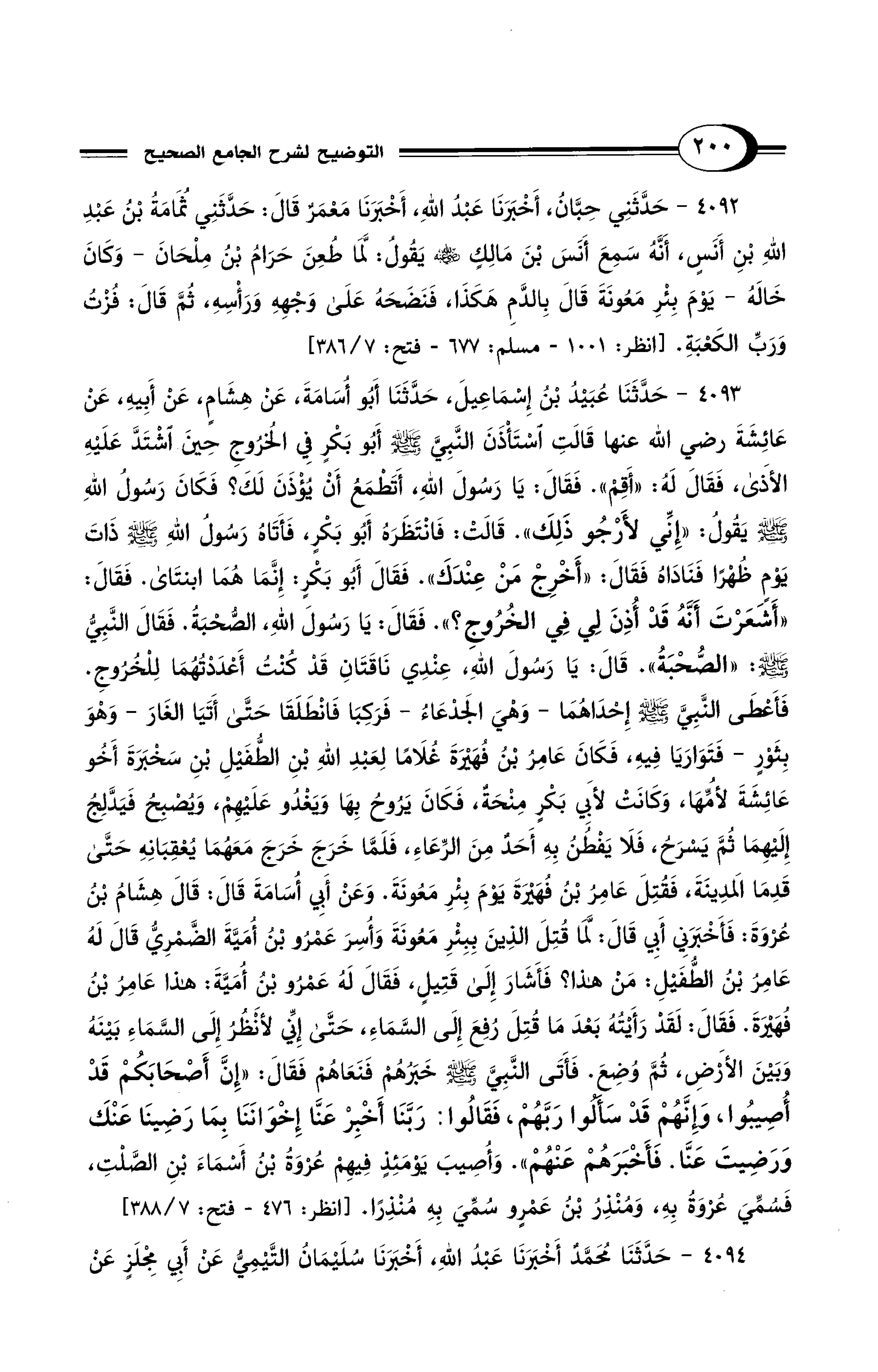 4093 - حَدَّثَنَا عُبَيْدُ بْنُ إِسْمَاعِيلَ, حَدَّثَنَا أَبُو أُسَامَةَ, عَنْ هِشَامٍ, عَنْ أَبِيه, عَنْ عَائِشَةَ - رضي الله عنها - قَالَتِ اسْتَأْذَنَ النَّبِيَّ - صلى الله عليه وسلم - أَبُو بَكْرٍ فِي الْخُرُوجِ حِينَ اشْتَدَّ عَلَيْهِ الأَذَى، فَقَالَ لَه: "أَقِمْ". فَقَال: يَا رَسُولَ اللَّهِ أَتَطْمَعُ أَنْ يُؤْذَنَ لَكَ؟ فَكَانَ رَسُولُ اللَّهِ - صلى الله عليه وسلم - يَقُول: "إِنِّي لأَرْجُو ذَلِكَ". قَالَتْ فَانْتَظَرَهُ أَبُو بَكْر, فَأَتَاهُ رَسُولُ اللَّهِ - صلى الله عليه وسلم - ذَاتَ يَوْمٍ ظُهْرًا فَنَادَاهُ فَقَال: "أَخْرِجْ مَنْ عِنْدَكَ". فَقَالَ أَبُو بَكْرٍ: إِنَّمَا هُمَا ابْنَتَاىَ. فَقَالَ: "أَشَعَرْتَ أَنَّهُ قَدْ أُذِنَ لِي فِي الْخُرُوجِ؟ ". فَقَالَ: يَا رَسُولَ اللَّهِ, الصُّحْبَةُ. فَقَالَ النَّبِيُّ - صلى الله عليه وسلم -: "الصُّحْبَةُ".