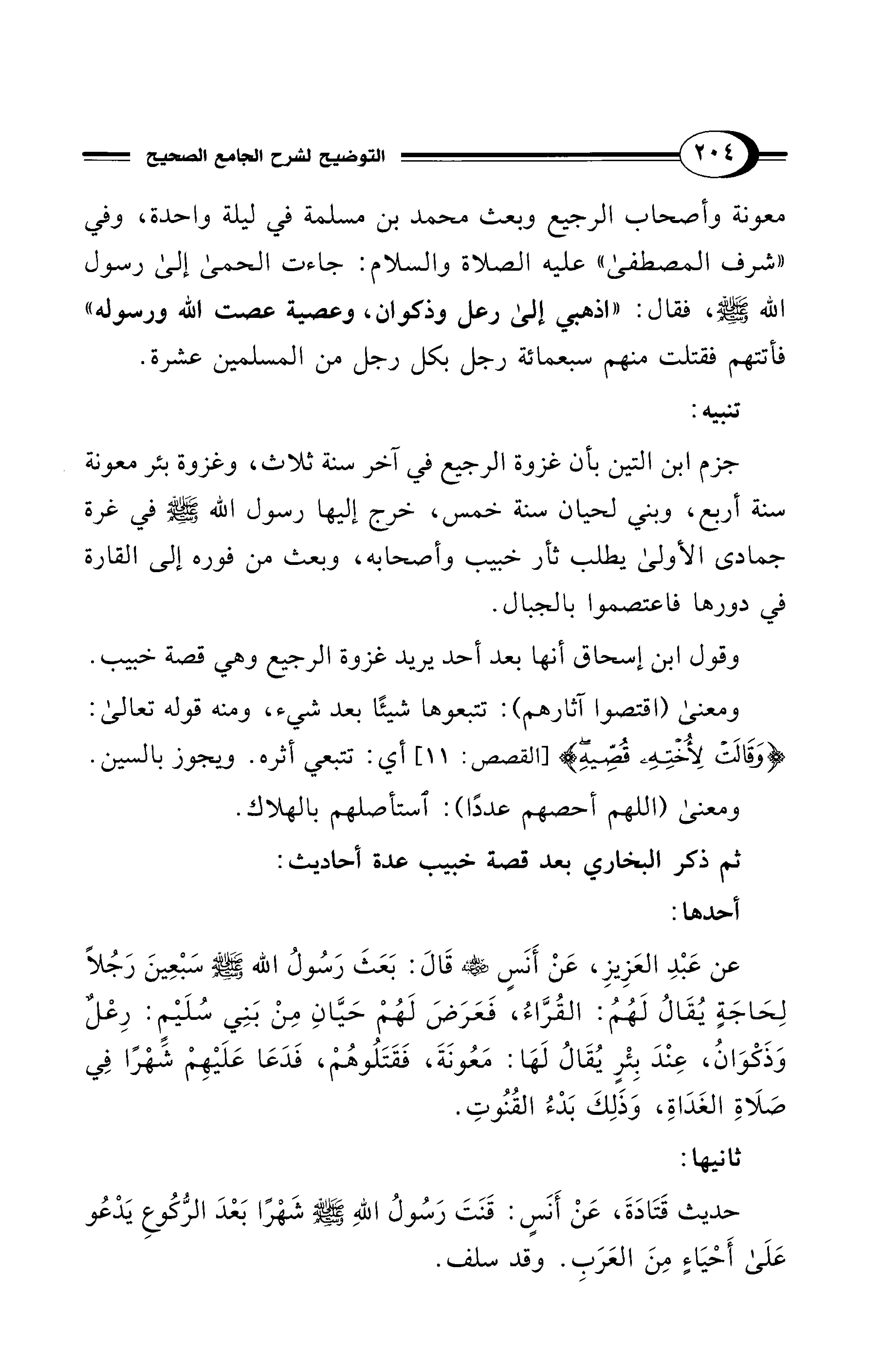 عن عَبْدِ العَزِيزِ، عَنْ أنَسٍ - عليه السلام - قَالَ: بَعَثَ رَسُولُ الله - صلى الله عليه وسلم - سَبْعِينَ رَجُلاً لِحَاجَةٍ يُقَالُ لَهُمُ: القُرَّاءُ، فَعَرَضَ لَهُمْ حَيَّانِ مِنْ بَنِي سُلَيْمٍ: رِعْلٌ وَذَكْوَانُ، عِنْدَ بِئْرٍ يُقَالُ لَهَا: مَعُونَةَ، فَقَتَلُوهُمْ، فَدَعَا عَلَيْهِمْ شَهْرًا في صَلَاةِ الغَدَاةِ، وَذَلِكَ بَدْءُ القُنُوتِ.