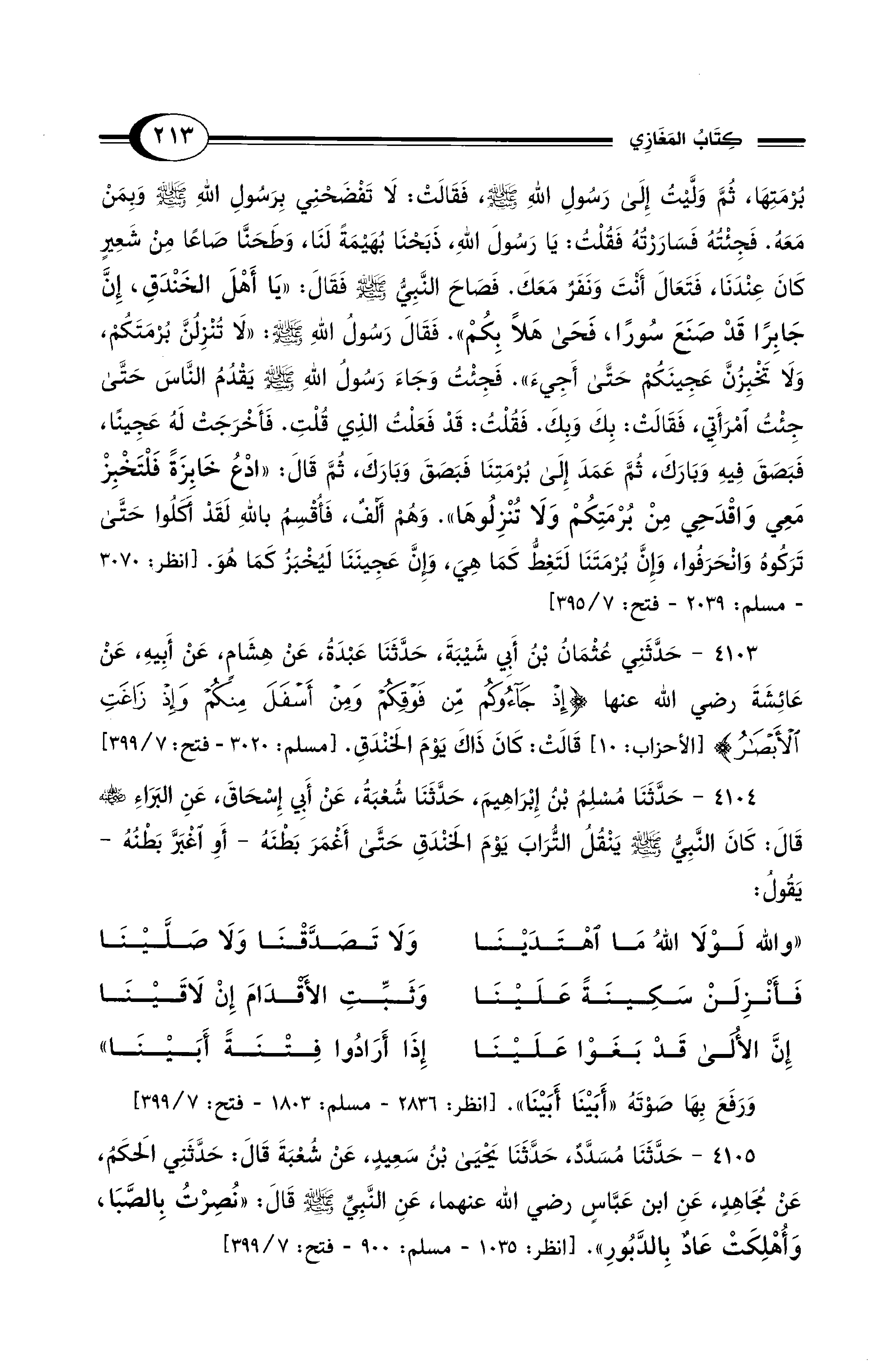 4104 - حَدَّثَنَا مُسْلِمُ بْنُ إِبْرَاهِيمَ, حَدَّثَنَا شُعْبَةُ, عَنْ أَبِي إِسْحَاقَ, عَنِ الْبَرَاءِ - رضي الله عنه - قَالَ: كَانَ النَّبِيُّ - صلى الله عليه وسلم - يَنْقُلُ التُّرَابَ يَوْمَ الْخَنْدَقِ حَتَّى أَغْمَرَ بَطْنَهُ -أَوِ اغْبَرَّ بَطْنُهُ- يَقُول: