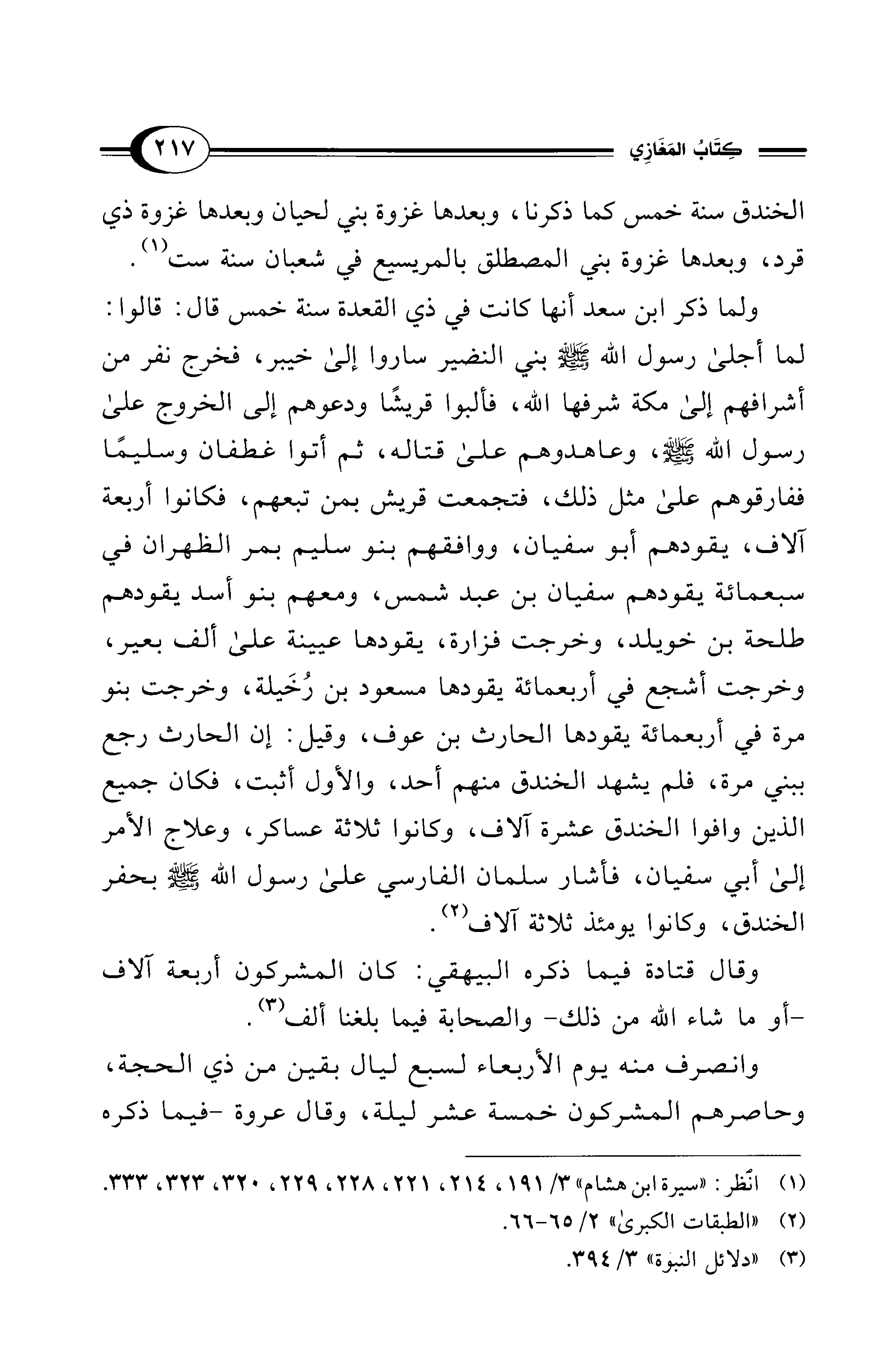 ولما ذكر ابن سعد أنها كانت في ذي القعدة سنة خمس قال: قالوا: لما أجلى رسول الله - صلى الله عليه وسلم - بني النضير ساروا إلى خيبر، فخرج نفر من أشرافهم إلى مكة شرفها الله، فألبوا قريشًا ودعوهم إلى الخروج على رسول الله - صلى الله عليه وسلم -، وعاهدوهم على قتاله، ثم أتوا غطفان وسليمًا ففارقوهم على مثل ذلك، فتجمعت قريش بمن تبعهم، فكانوا أربعة آلاف، يقودهم أبو سفيان، ووافقهم بنو سليم بمر الظهران في سبعمائة يقودهم سفيان بن عبد شمس، ومعهم بنو أسد يقودهم طلحة بن خويلد، وخرجت فزارة، يقودها عيينة على ألف بعير، وخرجت أشجع في أربعمائة يقودها مسعود بن رُخَيلة، وخرجت بنو مرة في أربعمائة يقودها الحارث بن عوف، وقيل: إن الحارث رجع ببني مرة، فلم يشهد الخندق منهم أحد، والأول أثبت، فكان جميع الذين وافوا الخندق عشرة آلاف، وكانوا ثلاثة عساكر، وعلاج الأمر إلى أبي سفيان، فأشار سلمان الفارسي على رسول الله - صلى الله عليه وسلم - الخندق، وكانوا يومئذ ثلاثة آلاف (¬2).