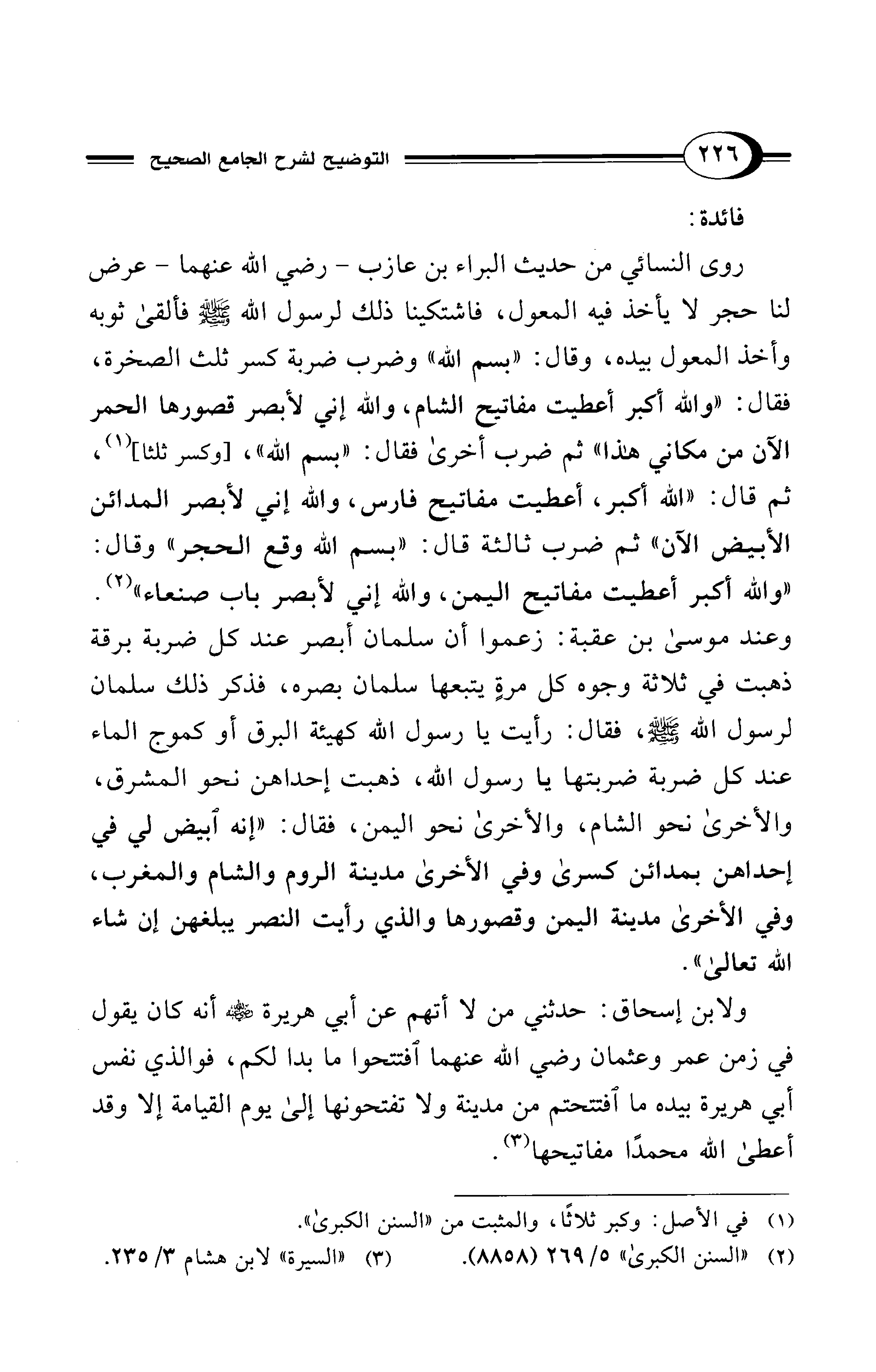 روى النسائي من حديث البراء بن عازب -رضي الله عنهما- عرض لنا حجر لا يأخذ فيه المعول، فاشتكينا ذلك لرسول الله - صلى الله عليه وسلم - فألقى ثوبه وأخذ المعول بيده، وقال: "بسم الله" وضرب ضربة كسر ثلث الصخرة، فقال: "والله أكبر أعطيت مفاتيح الشام، والله إني لأبصر قصورها الحمر الآن من مكاني هذا" ثم ضرب أخرى فقال: "بسم الله"، [وكسر ثلثا] (¬1)، ثم قال: "الله أكبر، أعطيت مفاتيح فارس، والله إني لأبصر المدائن الأبيض الآن" ثم ضرب ثالثة قال: "بسم الله وقع الحجر" وقال: "والله أكبر أعطيت مفاتيح اليمن، والله إني لأبصر باب صنعاء" (¬2).