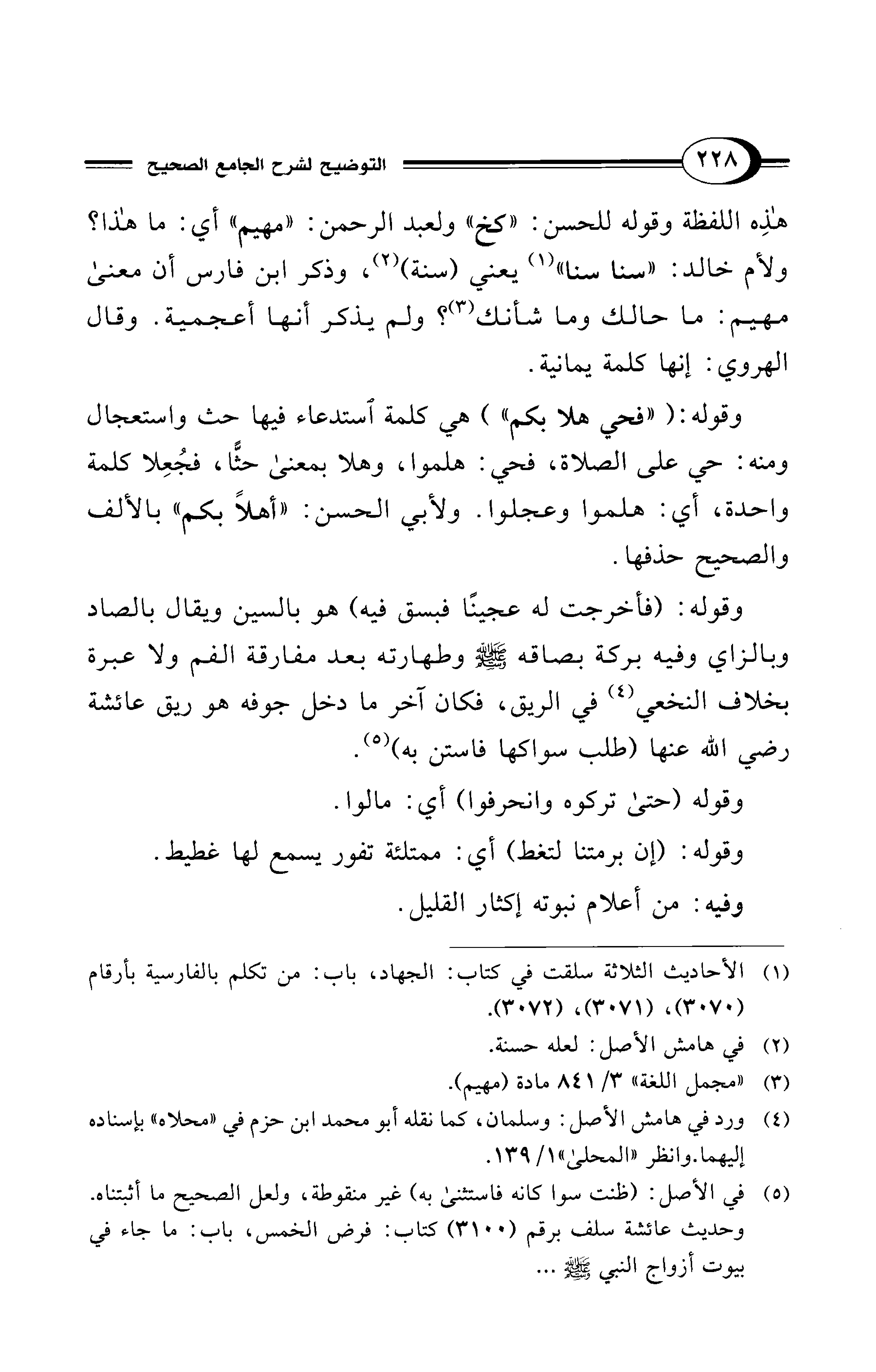 هذِه اللفظة وقوله للحسن: "كخ" ولعبد الرحمن: "مهيم" أي: ما هذا؟ ولأم خالد: "سنا سنا" (¬1) يعني (سنة) (¬2)، وذكر ابن فارس أن معنى مهيم: ما حالك وما شأنك (¬3)؟ ولم يذكر أنها أعجمية. وقال الهروي: إنها كلمة يمانية.
