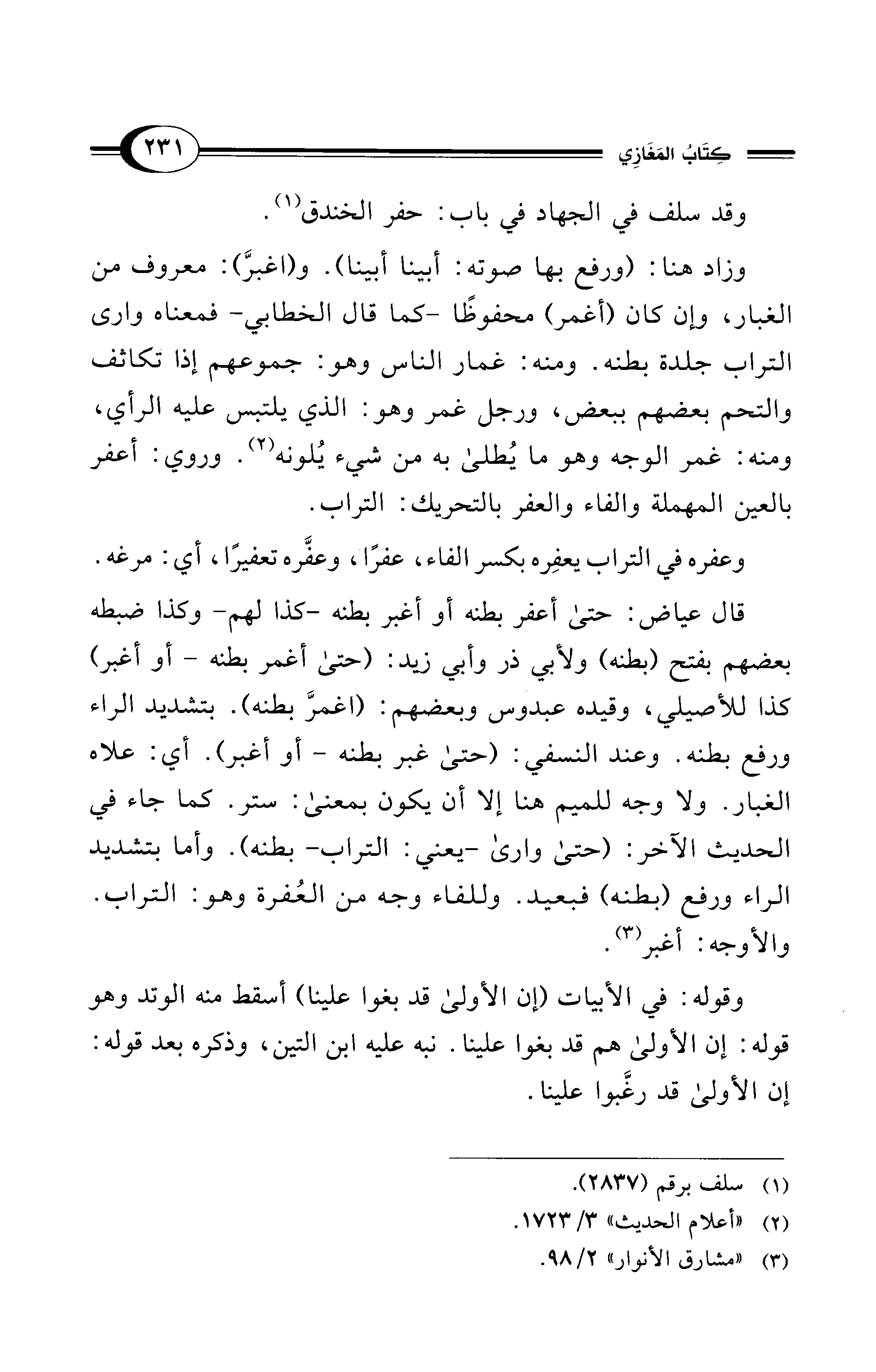 وعفره في التراب يعفِره بكسر الفاء، عفرًا، وعفَّره تعفيرًا، أي: مرغه. قال عياض: حتى أعفر بطنه أو أغبر بطنه -كذا لهم- وكذا ضبطه بعضهم بفتح (بطنه) ولأبي ذر وأبي زيد: (حتى أغمر بطنه - أو أغبر) كذا للأصيلي، وقيده عبدوس وبعضهم: (اغمرَّ بطنه). بتشديد الراء ورفع بطنه. وعند النسفي: (حتى غير بطنه- أو أغبر). أي: علاه الغبار. ولا وجه للميم هنا إلا أن يكون بمعنى: ستر. كما جاء في الحديث الآخر: (حتى وارى -يعني: التراب- بطنه). وأما بتشديد الراء ورفع (بطنه) فبعيد. وللفاء وجه من العُفرة وهو: التراب. والأوجه: أغبر (¬3).