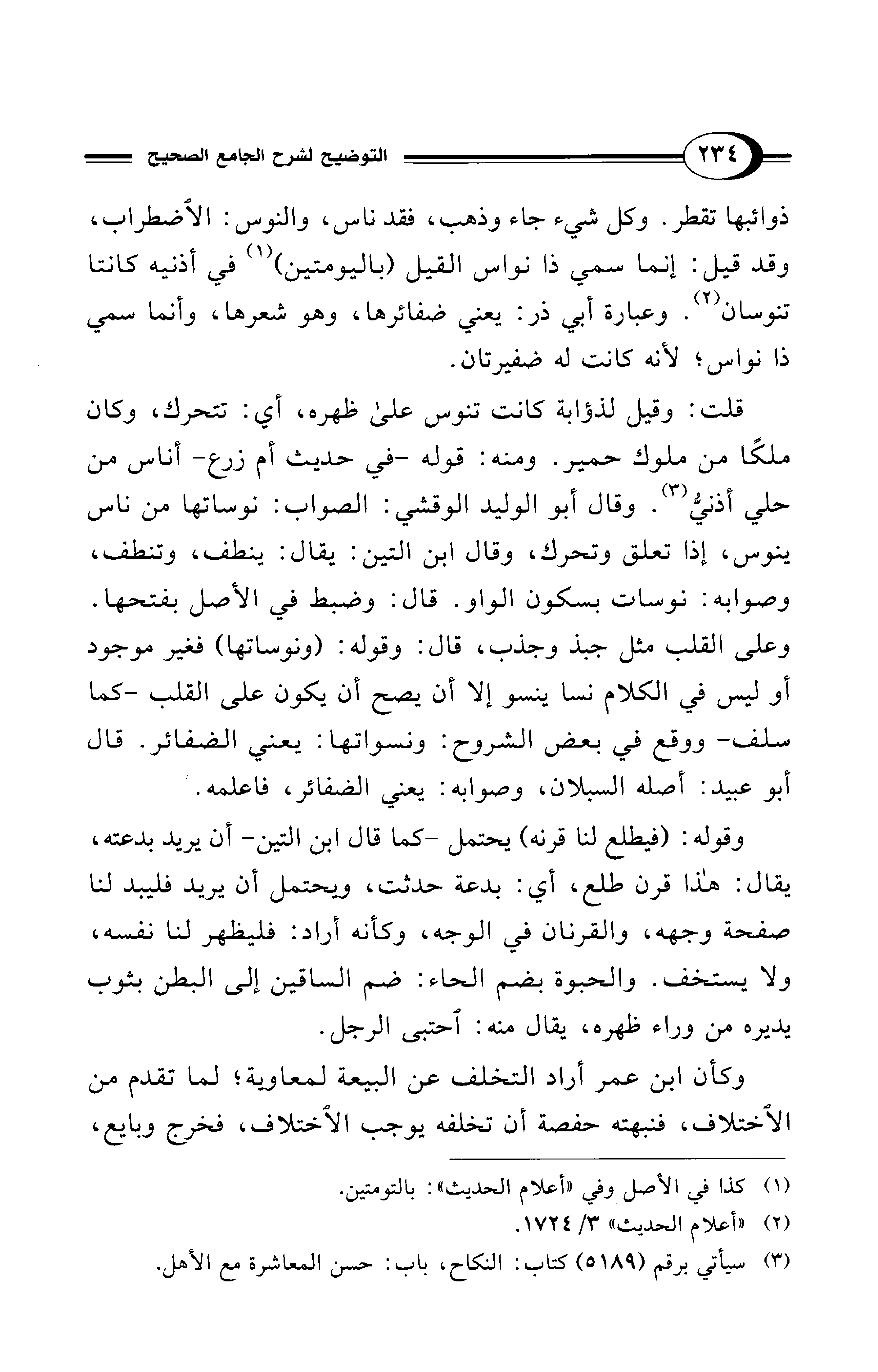 قلت: وقيل لذؤابة كانت تنوس على ظهره، أي: تتحرك، وكان ملكًا من ملوك حمير. ومنه: قوله -في حديث أم زرع- أناس من حلي أذنيُّ (¬3). وقال أبو الوليد الوقشي: الصواب: نوساتها من ناس ينوس، إذا تعلق وتحرك، وقال ابن التين: يقال: ينطف، وتنطف، وصوابه: نوسات بسكون الواو. قال: وضبط في الأصل بفتحها. وعلى القلب مثل جبذ وجذب، قال: وقوله: (ونوساتها) فغير موجود أو ليس في الكلام نسا ينسو إلا أن يصح أن يكون على القلب -كما سلف- ووقع في بعض الشروح: ونسواتها: يعني الضفائر. قال أبو عبيد: أصله السبلان، وصوابه: يعني الضفائر، فاعلمه.