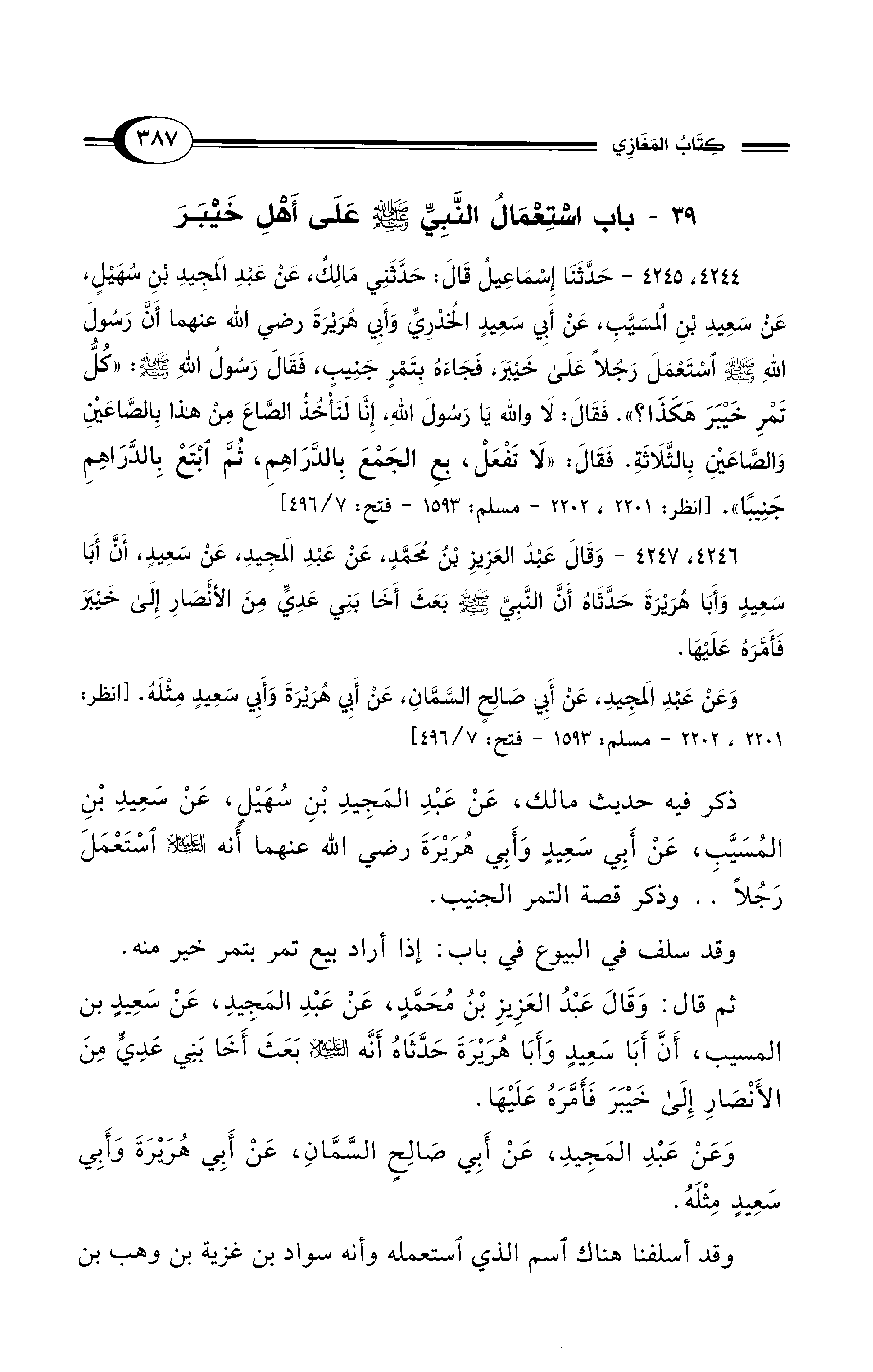 4244 و 4245 - حَدَّثَنَا إِسْمَاعِيلُ: قَالَ حَدَّثَنِي مَالِكٌ, عَنْ عَبْدِ الْمَجِيدِ بْنِ سُهَيْلٍ, عَنْ سَعِيدِ بْنِ الْمُسَيَّبِ, عَنْ أَبِي سَعِيدٍ الْخُدْرِيِّ وَأَبِي هُرَيْرَةَ - رضي الله عنهما - أَنَّ رَسُولَ اللهِ - صلى الله عليه وسلم - اسْتَعْمَلَ رَجُلاً عَلَى خَيْبَرَ، فَجَاءَهُ بِتَمْرٍ جَنِيبٍ، فَقَالَ رَسُولُ اللهِ - صلى الله عليه وسلم -: "كُلُّ تَمْرِ خَيْبَرَ هَكَذَا؟ ". فَقَالَ: لاَ وَاللهِ يَا رَسُولَ اللهِ، إِنَّا لَنَأْخُذُ الصَّاعَ مِنْ هَذَا بِالصَّاعَيْنِ وَالصَّاعَيْنِ بِالثَّلاَثَةِ. فَقَالَ: "لاَ تَفْعَلْ، بِعِ الْجَمْعَ بِالدَّرَاهِمِ، ثُمَّ ابْتَعْ بِالدَّرَاهِمِ جَنِيبًا". [انظر: 2201، 2202 - مسلم: 1593 - فتح: 7/ 496]
