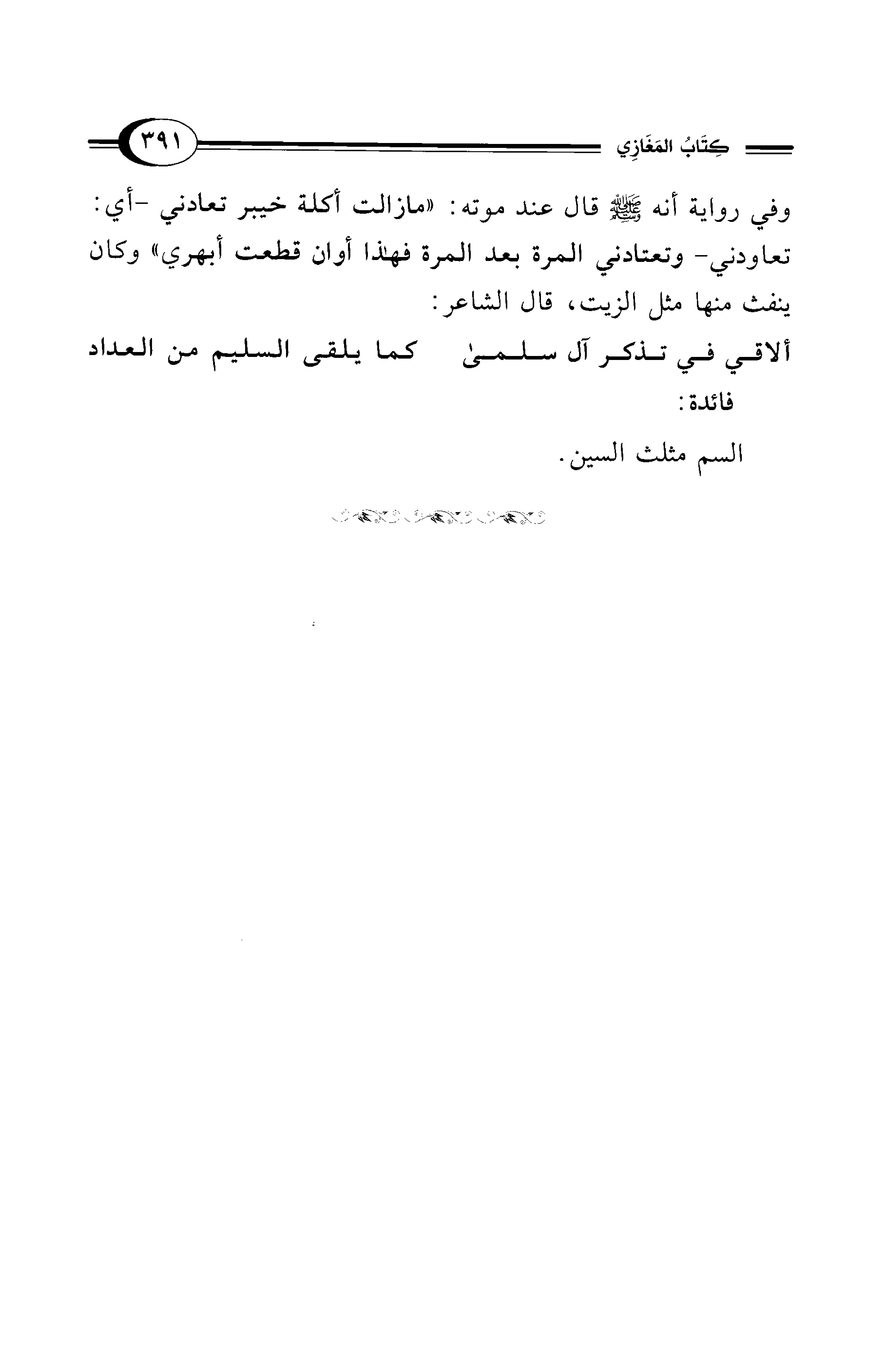 وفي رواية أنه - صلى الله عليه وسلم - قال عند موته: "مازالت أكلة خيبر تعادني -أي: تعاودني- وتعتادني المرة بعد المرة فهذا أوان قطعت أبهري" وكان ينفث منها مثل الزيت، قال الشاعر: