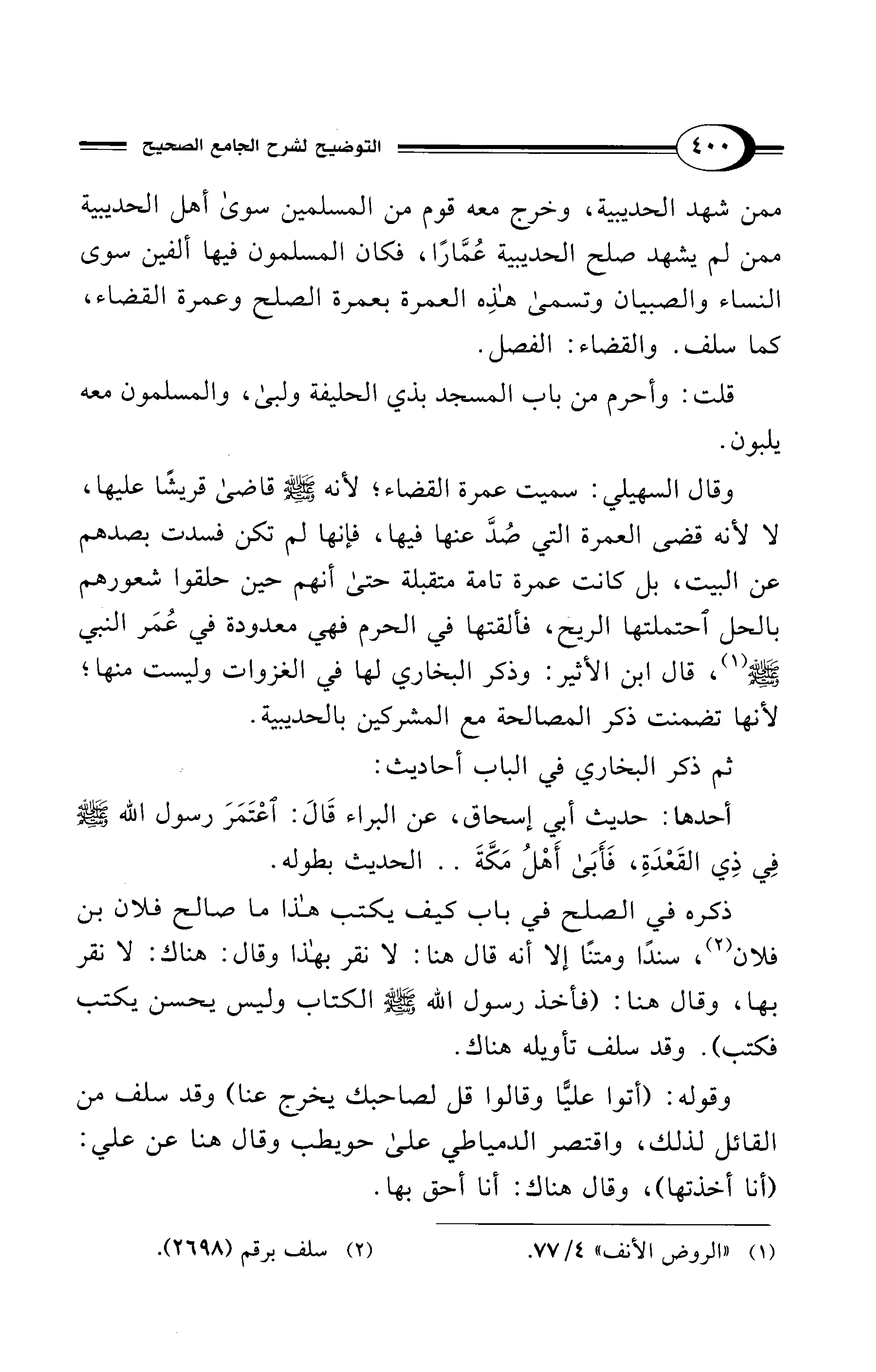وقال السهيلي: سميت عمرة القضاء؛ لأنه - صلى الله عليه وسلم - قاضى قريشًا عليها، لا لأنه قضى العمرة التي صُدَّ عنها فيها، فإنها لم تكن فسدت بصدهم عن البيت، بل كانت عمرة تامة متقبلة حتى أنهم حين حلقوا شعورهم بالحل احتملتها الريح، فألقتها في الحرم فهي معدودة في عُمَر النبي - صلى الله عليه وسلم - (¬1)، قال ابن الأثير: وذكر البخاري لها في الغزوات وليست منها؛ لأنها تضمنت ذكر المصالحة مع المشركين بالحديبية.