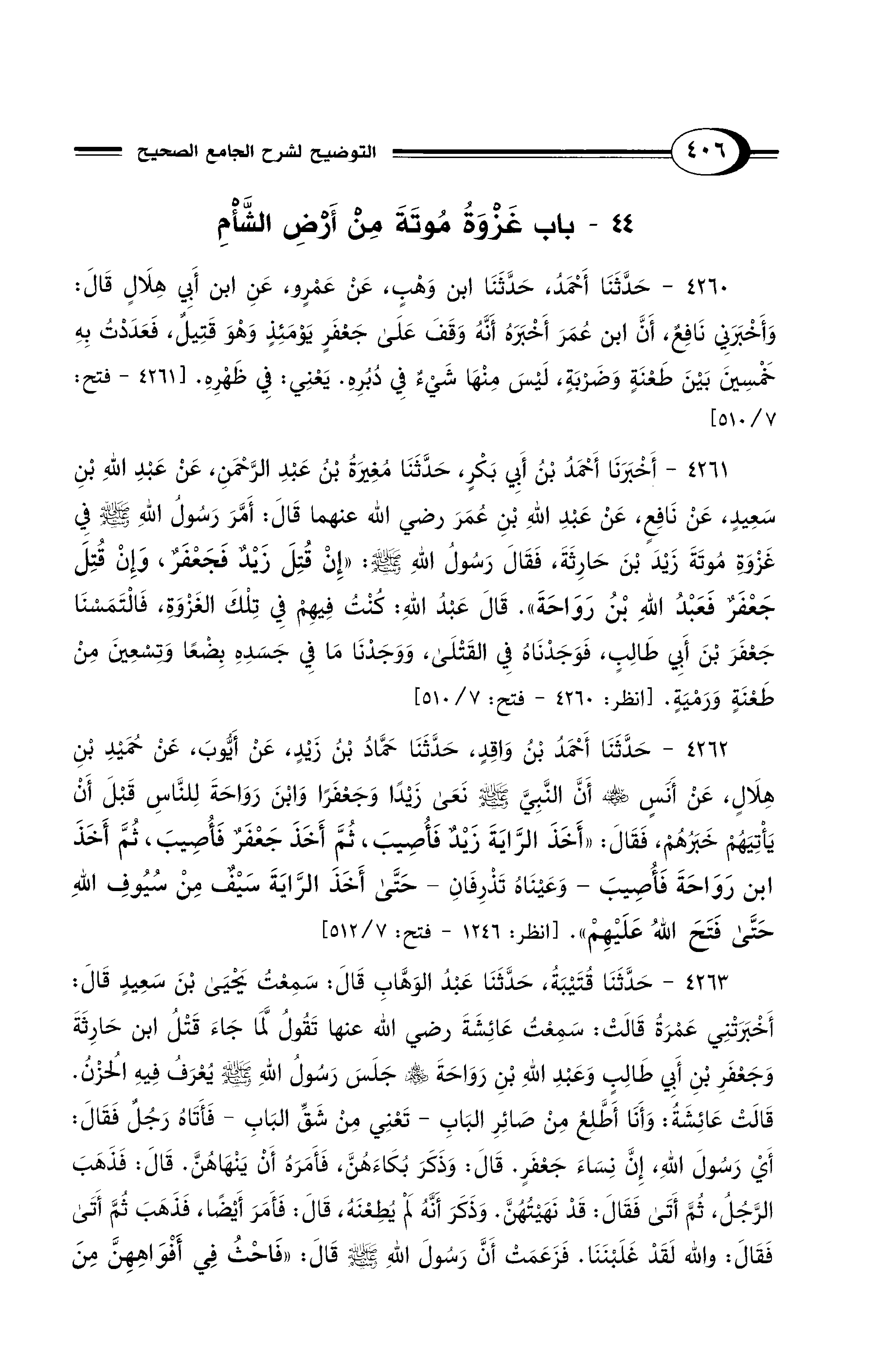 4261 - أَخْبَرَنَا أَحْمَدُ بْنُ أَبِي بَكْرٍ, حَدَّثَنَا مُغِيرَةُ بْنُ عَبْدِ الرَّحْمَنِ, عَنْ عَبْدِ اللهِ بْنِ سَعِيدٍ, عَنْ نَافِعٍ, عَنْ عَبْدِ اللهِ بْنِ عُمَرَ - رضي الله عنهما - قَالَ: أَمَّرَ رَسُولُ اللهِ - صلى الله عليه وسلم - فِي غَزْوَةِ مُوتَةَ زَيْدَ بْنَ حَارِثَةَ، فَقَالَ رَسُولُ اللهِ - صلى الله عليه وسلم -: "إنْ قُتِلَ زَيْدٌ فَجَعْفَرٌ، وَإِنْ قُتِلَ جَعْفَرٌ فَعَبْدُ اللهِ بْنُ رَوَاحَةَ". قَالَ عَبْدُ اللهِ: كُنْتُ فِيهِمْ فِي تِلْكَ الْغَزْوَةِ, فَالْتَمَسْنَا جَعْفَرَ بْنَ أَبِي طَالِبٍ، فَوَجَدْنَاهُ فِي الْقَتْلَى، وَوَجَدْنَا مَا فِي جَسَدِهِ بِضْعًا وَتِسْعِينَ مِنْ طَعْنَةٍ وَرَمْيَةٍ. [انظر: 4260 - فتح: 7/ 510]