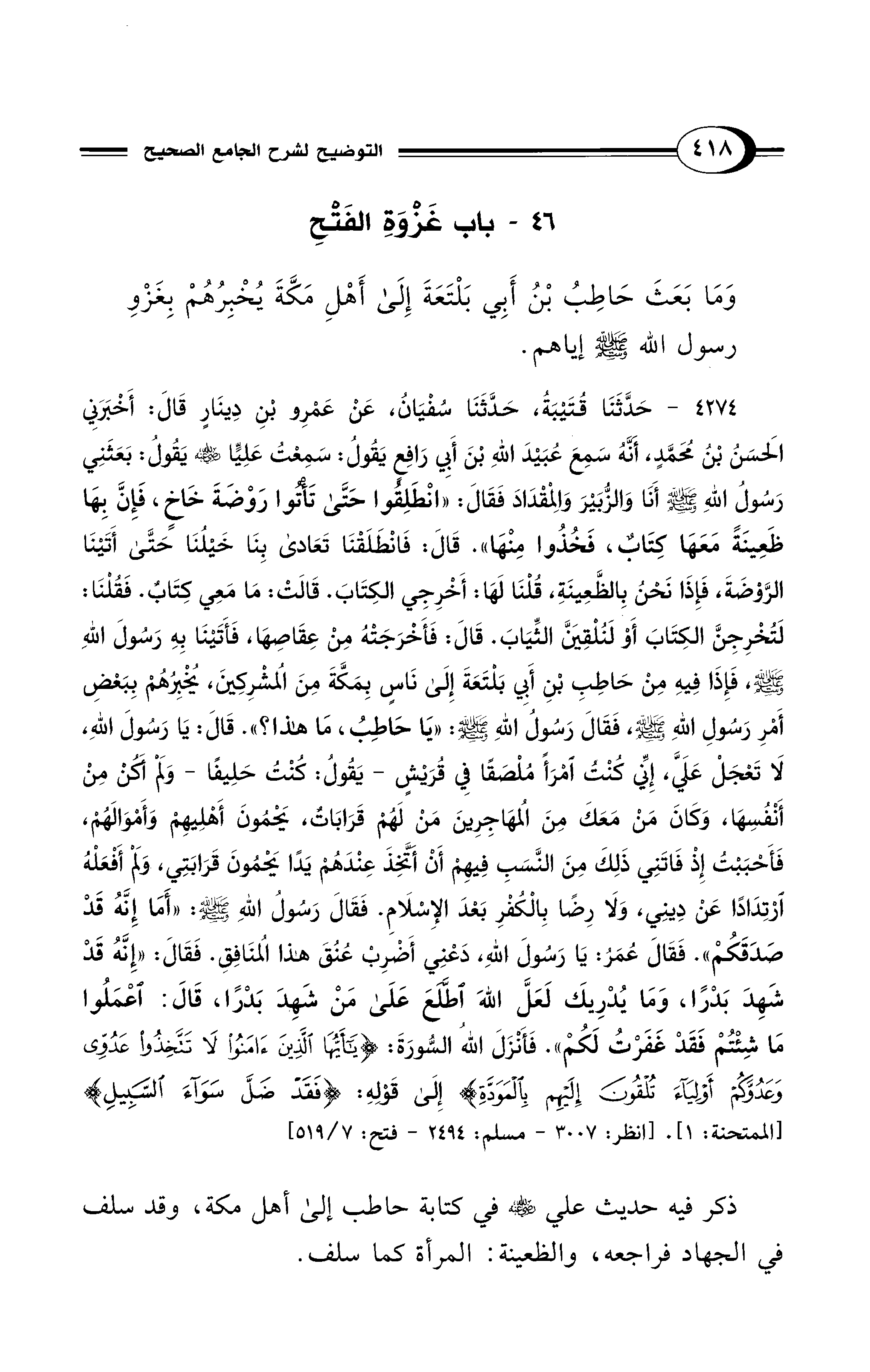 4274 - حَدَّثَنَا قُتَيْبَةُ, حَدَّثَنَا سُفْيَانُ, عَنْ عَمْرِو بْنِ دِينَارٍ قَالَ: أَخْبَرَنِي الْحَسَنُ بْنُ مُحَمَّدٍ, أَنَّهُ سَمِعَ عُبَيْدَ اللهِ بْنَ أَبِي رَافِعٍ يَقُولُ: سَمِعْتُ عَلِيًّا - رضي الله عنه - يَقُولُ: بَعَثَنِي رَسُولُ اللهِ - صلى الله عليه وسلم - أَنَا وَالزُّبَيْرَ وَالْمِقْدَادَ فَقَالَ: "انْطَلِقُوا حَتَّى تَأْتُوا رَوْضَةَ خَاخٍ، فَإِنَّ بِهَا ظَعِينَةً مَعَهَا كِتَابٌ، فَخُذُوا مِنْهَا". قَالَ: فَانْطَلَقْنَا تَعَادَى بِنَا خَيْلُنَا حَتَّى أَتَيْنَا الرَّوْضَةَ، فَإِذَا نَحْنُ بِالظَّعِينَةِ قُلْنَا لَهَا: أَخْرِجِي الْكِتَابَ. قَالَتْ: مَا مَعِي كِتَابٌ. فَقُلْنَا لَتُخْرِجِنَّ الْكِتَابَ أَوْ لَنُلْقِيَنَّ الثِّيَابَ. قَالَ: فَأَخْرَجَتْهُ مِنْ عِقَاصِهَا، فَأَتَيْنَا بِهِ رَسُولَ اللهِ - صلى الله عليه وسلم -, فَإِذَا فِيهِ مِنْ حَاطِبِ بْنِ أَبِي بَلْتَعَةَ إِلَى نَاسٍ بِمَكَّةَ مِنَ الْمُشْرِكِينَ، يُخْبِرُهُمْ بِبَعْضِ أَمْرِ رَسُولِ اللهِ - صلى الله عليه وسلم ,- فَقَالَ رَسُولُ اللهِ - صلى الله عليه وسلم -: "يَا حَاطِبُ مَا هَذَا؟ ". قَالَ: يَا رَسُولَ اللهِ, لاَ تَعْجَلْ عَلَيَّ، إِنِّي كُنْتُ امْرَأً مُلْصَقًا فِي قُرَيْشٍ -يَقُولُ: كُنْتُ حَلِيفًا- وَلَمْ أَكُنْ مِنْ أَنْفُسِهَا , وَكَانَ مَنْ مَعَكَ مِنَ الْمُهَاجِرِينَ مَنْ لَهُمْ قَرَابَاتٌ، يَحْمُونَ أَهْلِيهِمْ وَأَمْوَالَهُمْ، فَأَحْبَبْتُ إِذْ فَاتَنِي ذَلِكَ مِنَ النَّسَبِ فِيهِمْ أَنْ أَتَّخِذَ عِنْدَهُمْ يَدًا يَحْمُونَ قَرَابَتِي، وَلَمْ أَفْعَلْهُ ارْتِدَادًا عَنْ دِينِي، وَلاَ رِضًا بِالْكُفْرِ بَعْدَ الإِسْلاَمِ. فَقَالَ رَسُولُ اللهِ - صلى الله عليه وسلم -: "أَمَا إِنَّهُ قَدْ صَدَقَكُمْ". فَقَالَ عُمَرُ: يَا رَسُولَ اللهِ دَعْنِي أَضْرِبْ عُنُقَ هَذَا الْمُنَافِقِ. فَقَالَ: "إِنَّهُ قَدْ شَهِدَ بَدْرًا، وَمَا يُدْرِيكَ لَعَلَّ اللَّهَ اطَّلَعَ عَلَى مَنْ شَهِدَ بَدْرًا, قَالَ: اعْمَلُوا مَا شِئْتُمْ فَقَدْ غَفَرْتُ لَكُمْ". فَأَنْزَلَ اللهُ السُّورَةَ {يَا أَيُّهَا الَّذِينَ آمَنُوا لَا تَتَّخِذُوا عَدُوِّي وَعَدُوَّكُمْ أَوْلِيَاءَ تُلْقُونَ إِلَيْهِمْ بِالْمَوَدَّةِ} إِلَى قَوْلِهِ: {فَقَدْ ضَلَّ سَوَاءَ السَّبِيلِ} [الممتحنة: 1]. [انظر: 3007 - مسلم: 2494 - فتح: 7/ 519]