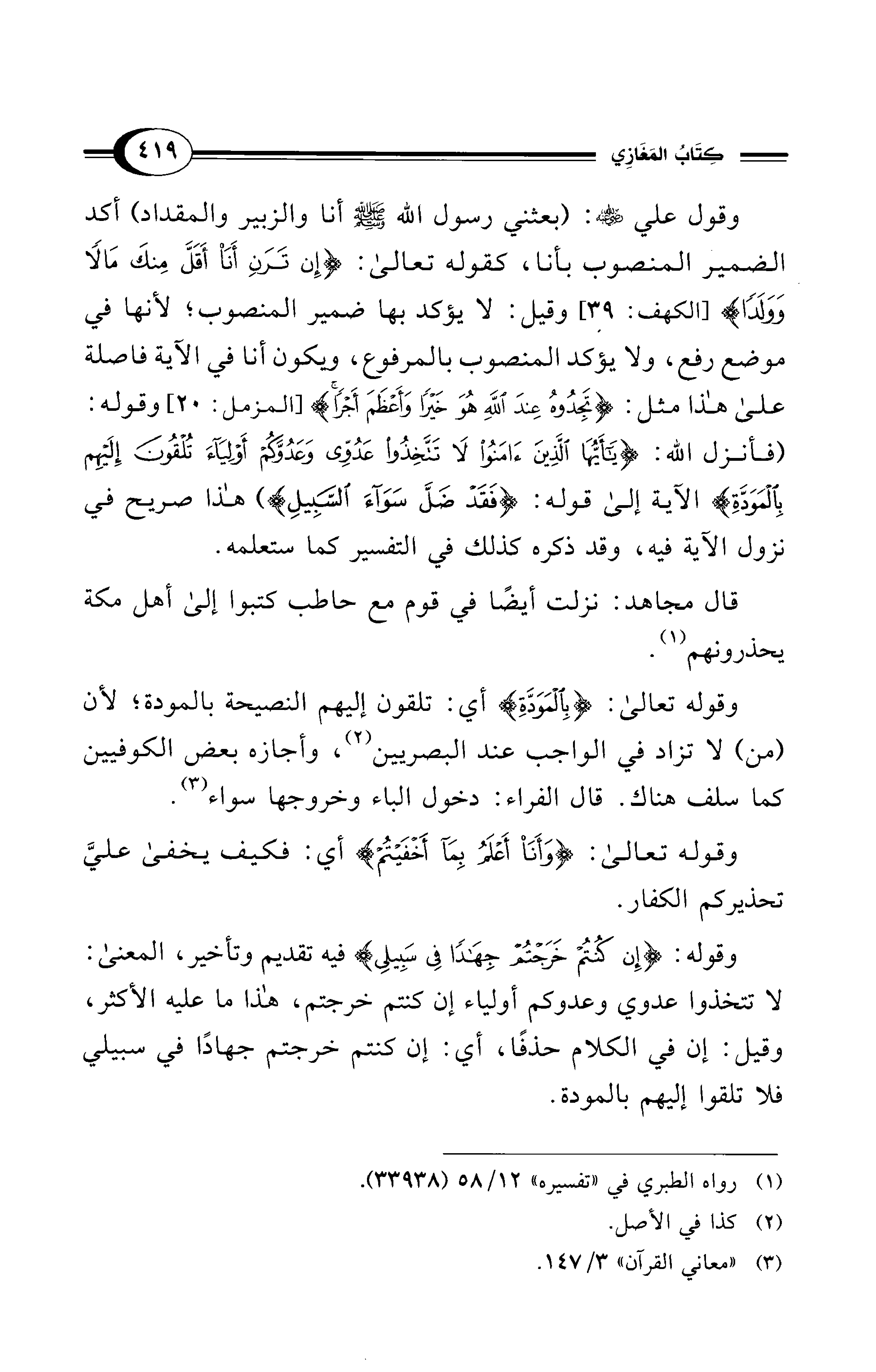 وقول علي - رضي الله عنه -: (بعثني رسول الله - صلى الله عليه وسلم - أنا والزبير والمقداد) أكد الضمير المنصوب بأنا، كقوله تعالى: {إِنْ تَرَنِ أَنَا أَقَلَّ مِنْكَ مَالًا وَوَلَدًا} [الكهف: 39] وقيل: لا يؤكد بها ضمير المنصوب؛ لأنها في موضع رفع، ولا يؤكد المنصوب بالمرفوع، ويكون أنا في الآية فاصلة على هذا مثل: {تَجِدُوهُ عِنْدَ اللهِ هُوَ خَيْرًا وَأَعْظَمَ أَجْرًا} [المزمل: 20] وقوله: (فأنزل الله: {يَا أَيُّهَا الَّذِينَ آمَنُوا لَا تَتَّخِذُوا عَدُوِّي وَعَدُوَّكُمْ أَوْلِيَاءَ تُلْقُونَ إِلَيْهِمْ بِالْمَوَدَّةِ} الآية إلى قوله: {فَقَدْ ضَلَّ سَوَاءَ السَّبِيلِ} هذا صريح في نزول الآية فيه، وقد ذكره كذلك في التفسير كما ستعلمه.