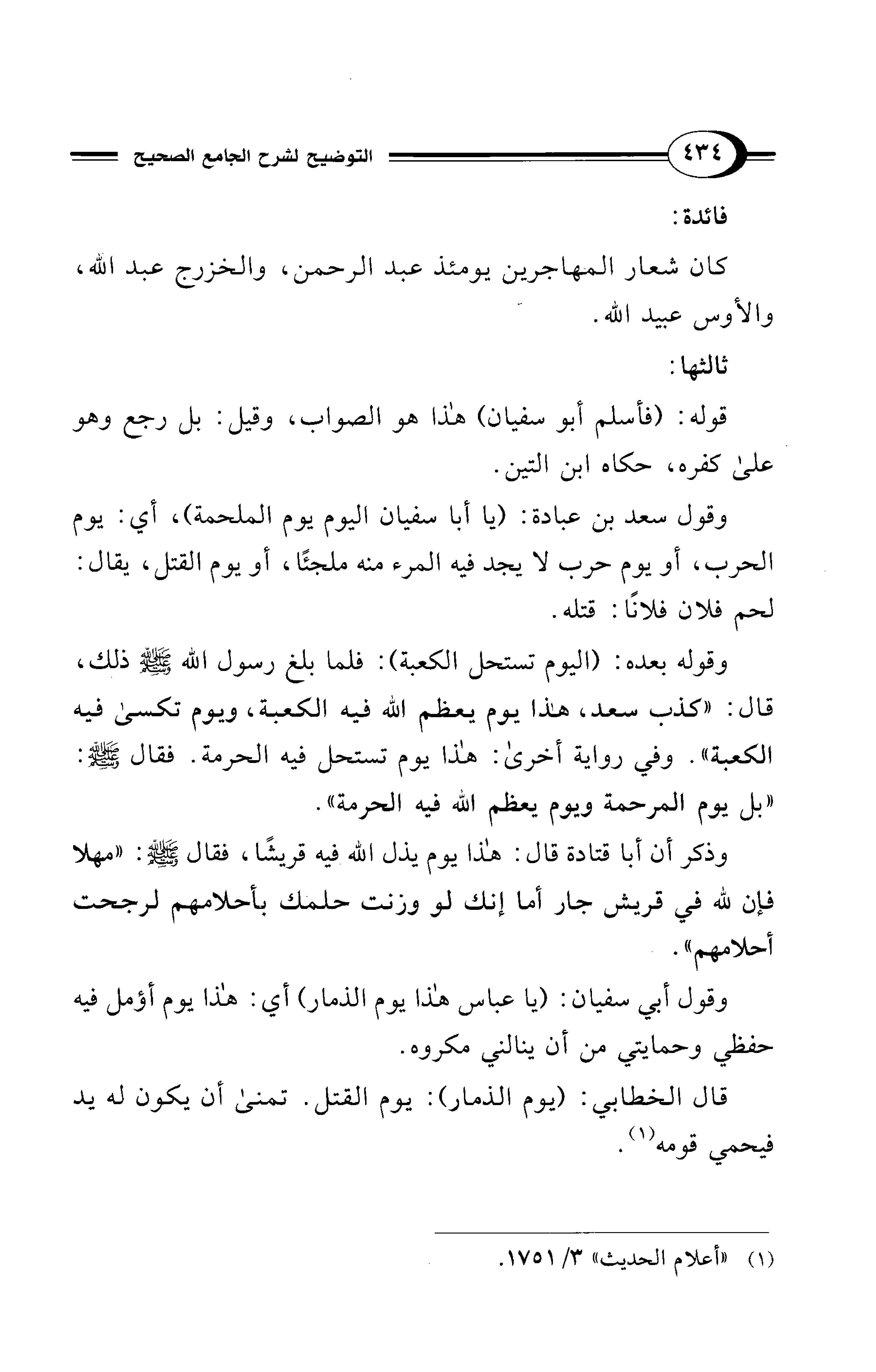 وقول سعد بن عبادة: (يا أبا سفيان اليوم يوم الملحمة)، أي: يوم الحرب، أو يوم حرب لا يجد فيه المرء منه ملجئًا، أو يوم القتل، يقال: لحم فلان فلانًا: قتله.