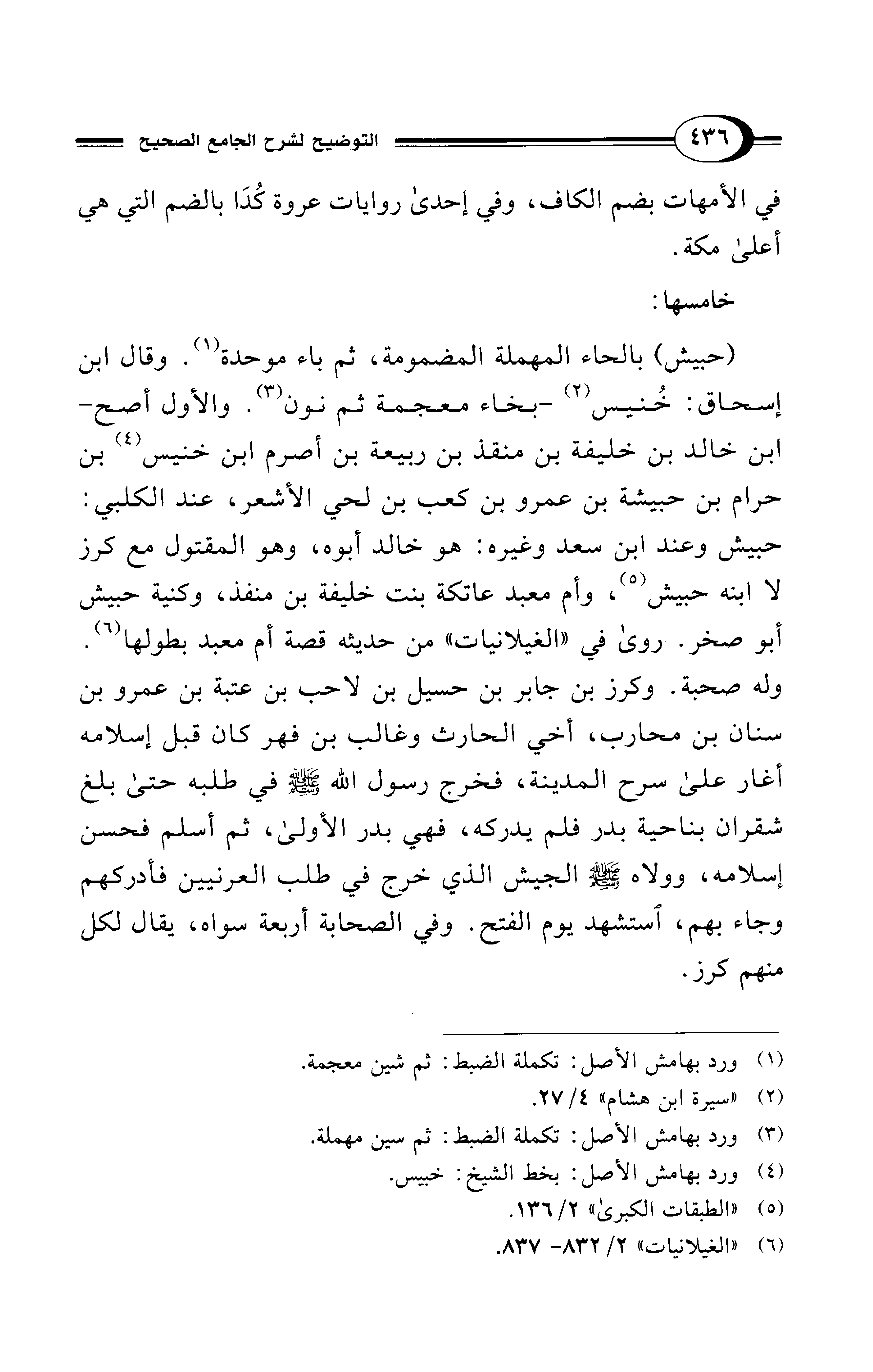 (حبيش) بالحاء المهملة المضمومة، ثم باء موحدة (¬1). وقال ابن إسحاق: خُنيس (¬2) -بخاء معجمة ثم نون (¬3). والأول أصح- ابن خالد بن خليفة بن منقذ بن ربيعة بن أصرم ابن خنيس (¬4) بن حرام بن حبيشة بن عمرو بن كعب بن لحي الأشعر، عند الكلبي: حبيش وعند ابن سعد وغيره: هو خالد أبوه، وهو المقتول مع كرز لا ابنه حبيش (¬5)، وأم معبد عاتكة بنت خليفة بن منفذ، وكنية حبيش أبو صخر. روى في "الغيلانيات" من حديثه قصة أم معبد بطولها (¬6). وله صحبة. وكرز بن جابر بن حسيل بن لاحب بن عتبة بن عمرو بن سنان بن محارب، أخي الحارث وغالب بن فهر كان قبل إسلامه أغار على سرح المدينة، فخرج رسول الله - صلى الله عليه وسلم - في طلبه حتى بلغ شقران بناحية بدر فلم يدركه، فهي بدر الأولى، ثم أسلم فحسن إسلامه، وولاه - صلى الله عليه وسلم - الجيش الذي خرج في طلب العرنيين فأدركهم وجاء بهم، استشهد يوم الفتح. وفي الصحابة أربعة سواه، يقال لكل منهم كرز.