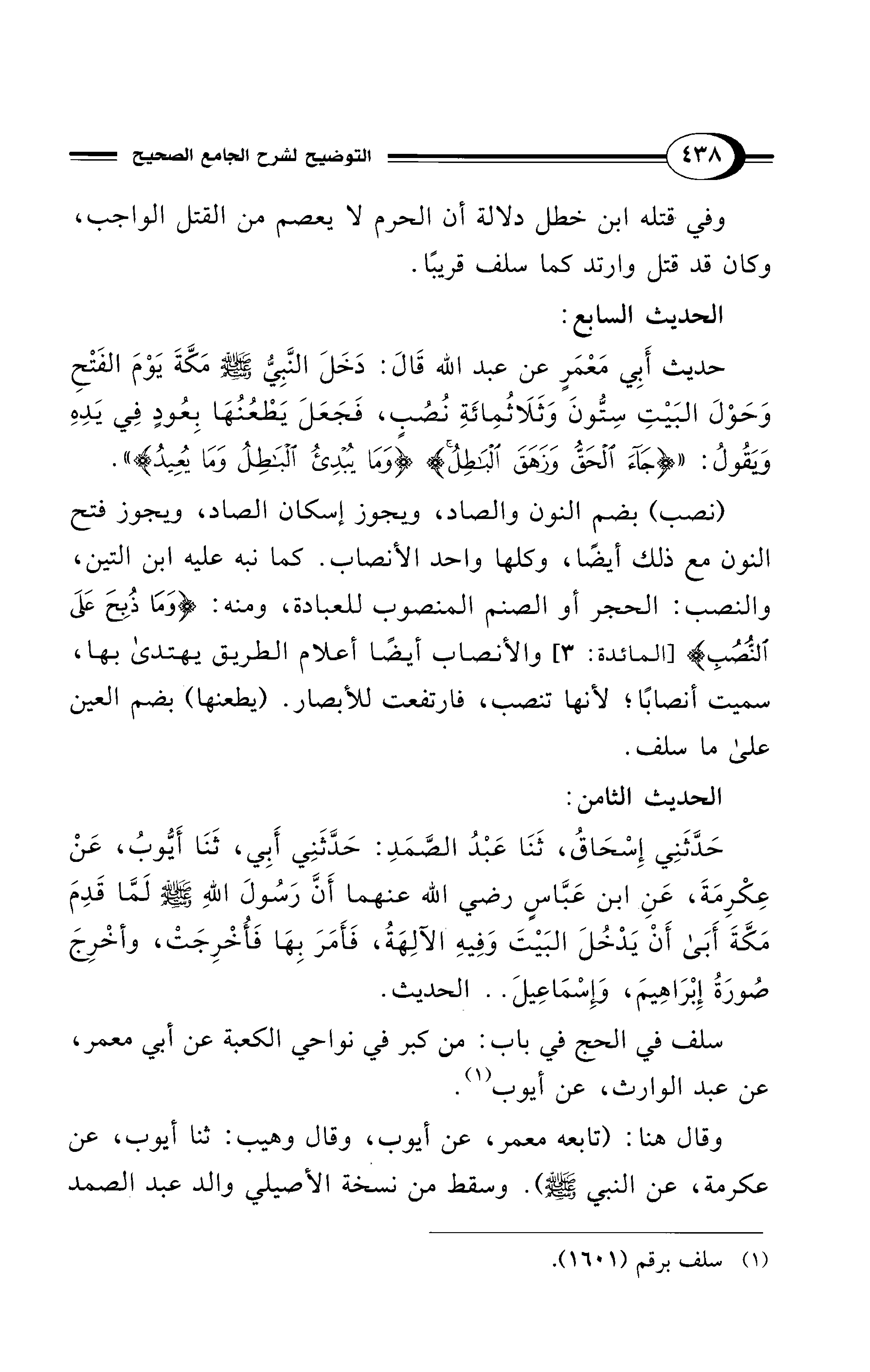 حديث أَبِي مَعْمَرٍ عن عبد الله قَالَ: دَخَلَ النَّبِيُّ - صلى الله عليه وسلم - مَكَّةَ يَوْمَ الفَتْحِ وَحَوْلَ البَيْتِ سِتُّونَ وَثَلَاثُمِائَةِ نُصُبٍ، فَجَعَلَ يَطعُنُهَا بِعُودٍ فِي يَدِهِ وَيَقُولُ: " {جَاءَ الْحَقُّ وَزَهَقَ الْبَاطِلُ} {وَمَا يُبْدِئُ الْبَاطِلُ وَمَا يُعِيدُ} ".