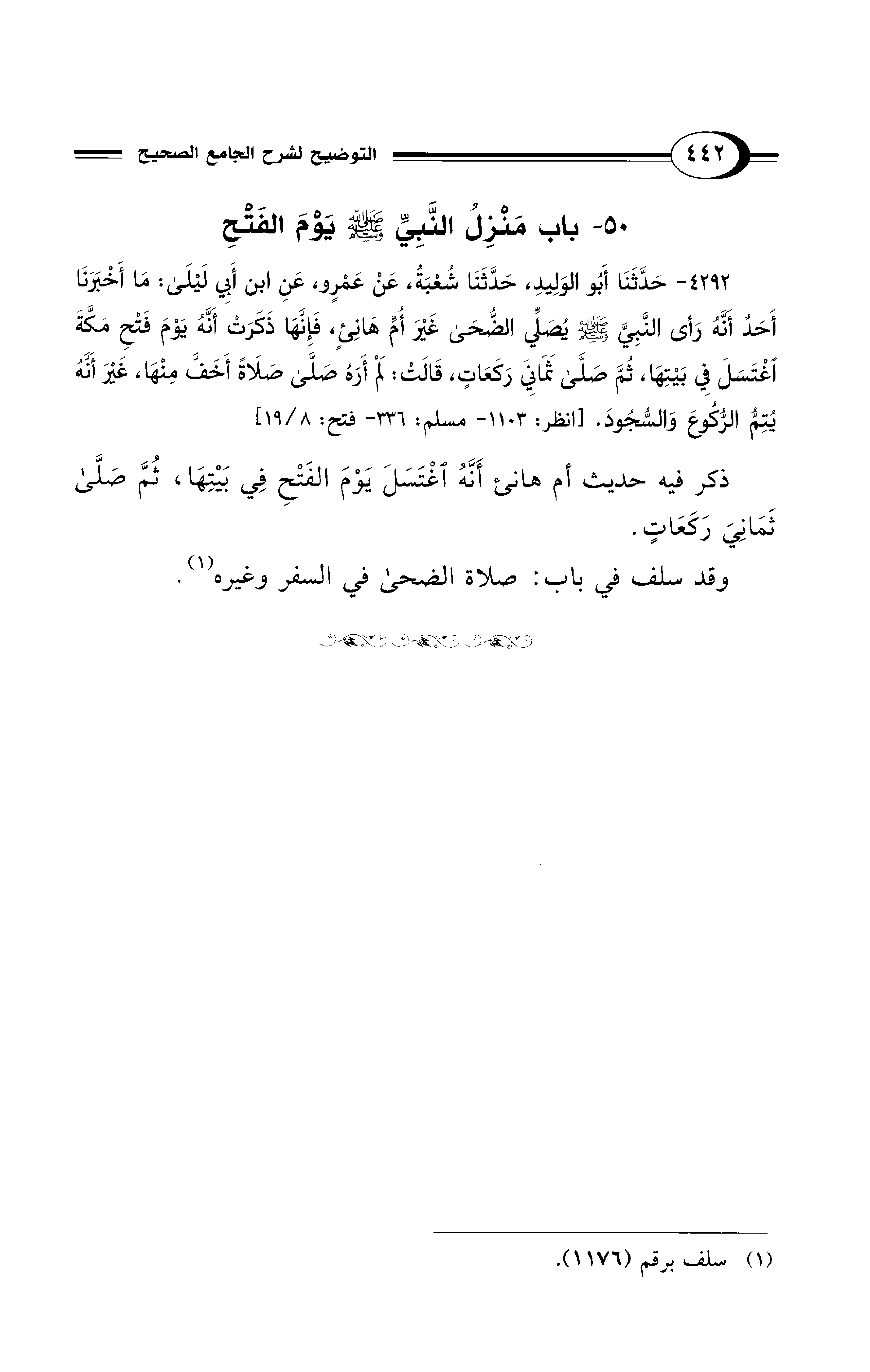 ذكر فيه حديث أم هانئ أَنَّهُ اغْتَسَلَ يَوْمَ الفَتْحِ فِي بَيْتِهَا، ثُمَّ صَلَّى ثَمَانِيَ رَكَعَاتٍ.