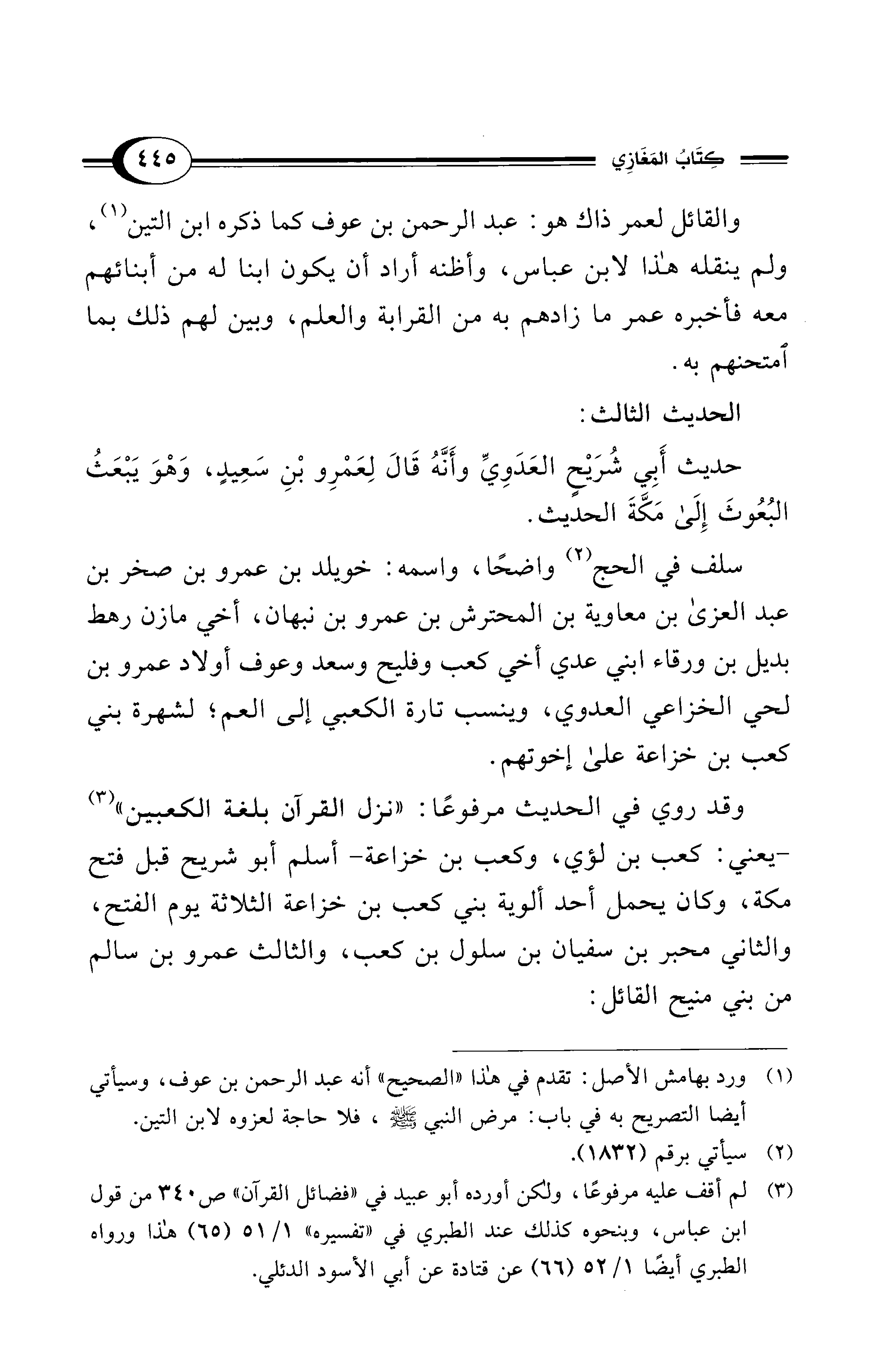 وقد روي في الحديث مرفوعًا: "نزل القرآن بلغة الكعبين" (¬3) -يعني: كعب بن لؤي، وكعب بن خزاعة- أسلم أبو شريح قبل فتح مكة، وكان يحمل أحد ألوية بني كعب بن خزاعة الثلاثة يوم الفتح، والثاني محبر بن سفيان بن سلول بن كعب، والثالث عمرو بن سالم من بني منيح القائل: