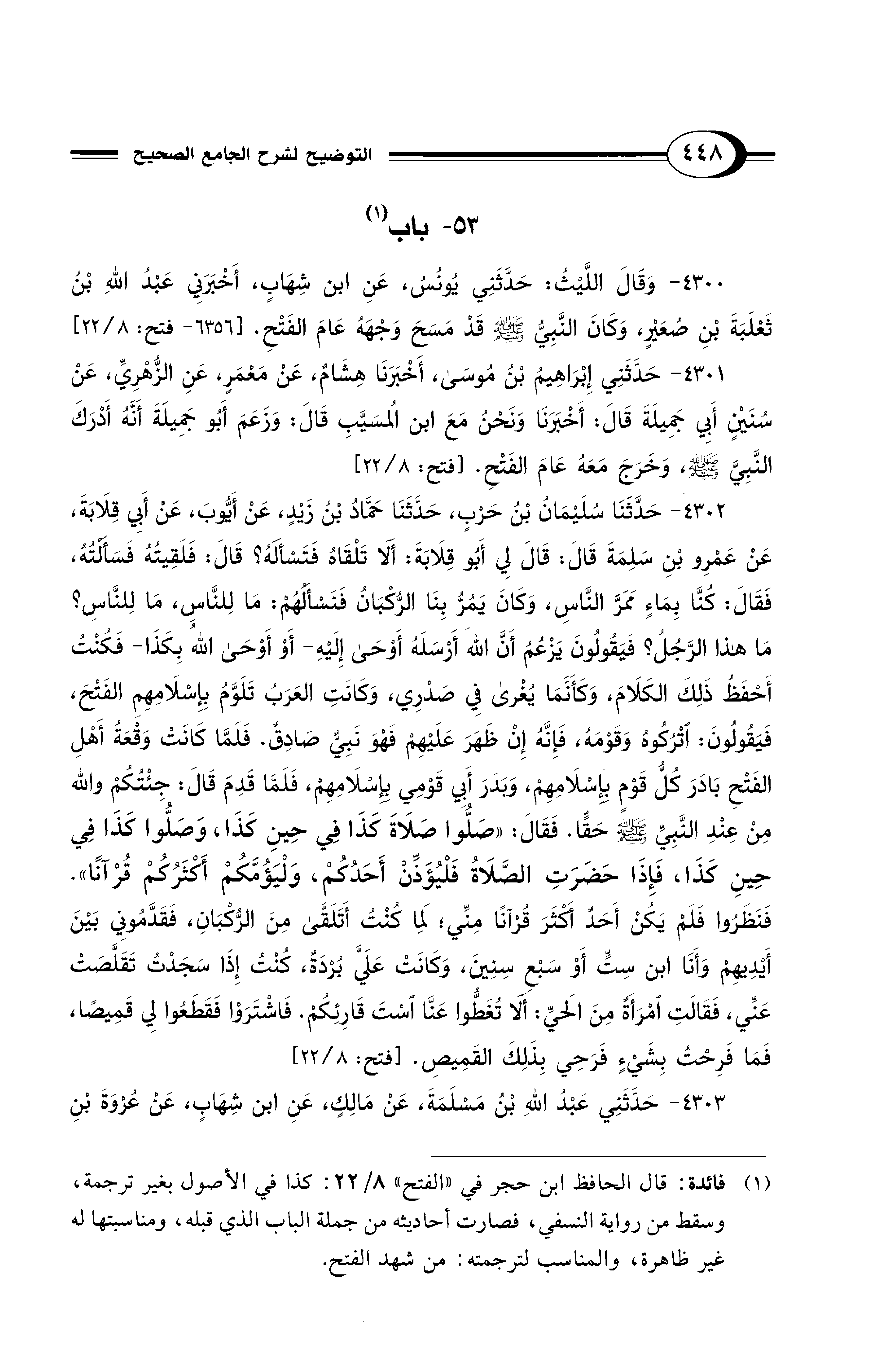 4300 - وَقَالَ اللَّيْثُ: حَدَّثَنِي يُونُسُ, عَنِ ابْنِ شِهَابٍ, أَخْبَرَنِي عَبْدُ اللهِ بْنُ ثَعْلَبَةَ بْنِ صُعَيْرٍ، وَكَانَ النَّبِيُّ - صلى الله عليه وسلم - قَدْ مَسَحَ وَجْهَهُ عَامَ الْفَتْحِ. [6356 - فتح: 8/ 22]