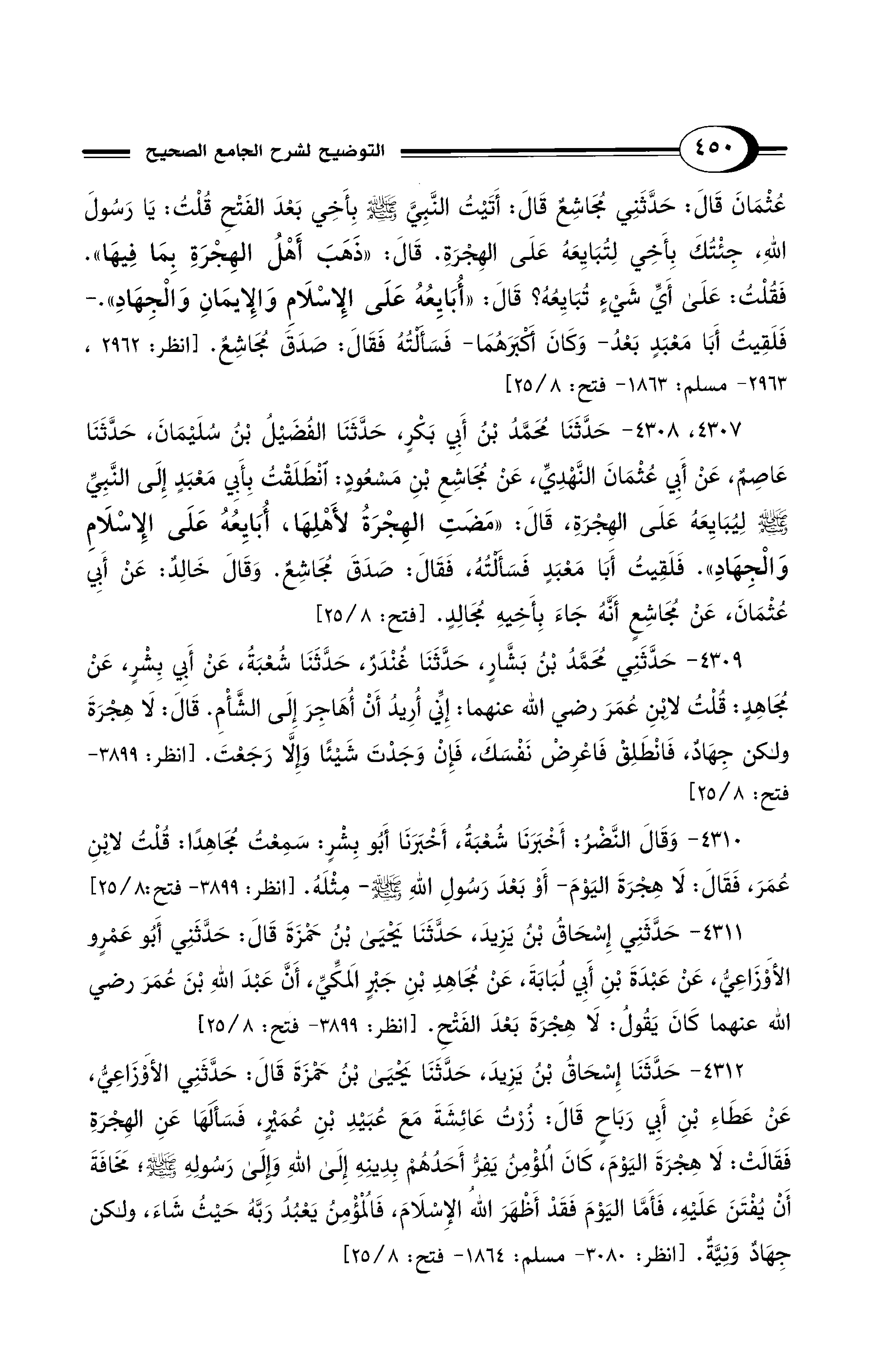 عُثْمَانَ قَالَ: حَدَّثَنِي مُجَاشِعٌ قَالَ: أَتَيْتُ النَّبِيَّ - صلى الله عليه وسلم - بِأَخِي بَعْدَ الْفَتْحِ قُلْتُ: يَارَسُولَ اللهِ، جِئْتُكَ بِأَخِي لِتُبَايِعَهُ عَلَى الْهِجْرَةِ. قَالَ "ذَهَبَ أَهْلُ الْهِجْرَةِ بِمَا فِيهَا". فَقُلْتُ: عَلَى أَيِّ شَيْءٍ تُبَايِعُهُ؟ قَالَ: "أُبَايِعُهُ عَلَى الإِسْلاَمِ وَالإِيمَانِ وَالْجِهَادِ". - فَلَقِيتُ أَبَا مَعْبَدٍ بَعْدُ -وَكَانَ أَكْبَرَهُمَا- فَسَأَلْتُهُ فَقَالَ: صَدَقَ مُجَاشِعٌ. [انظر:2962 ,2963 - مسلم: 1863 - فتح: 8/ 25]