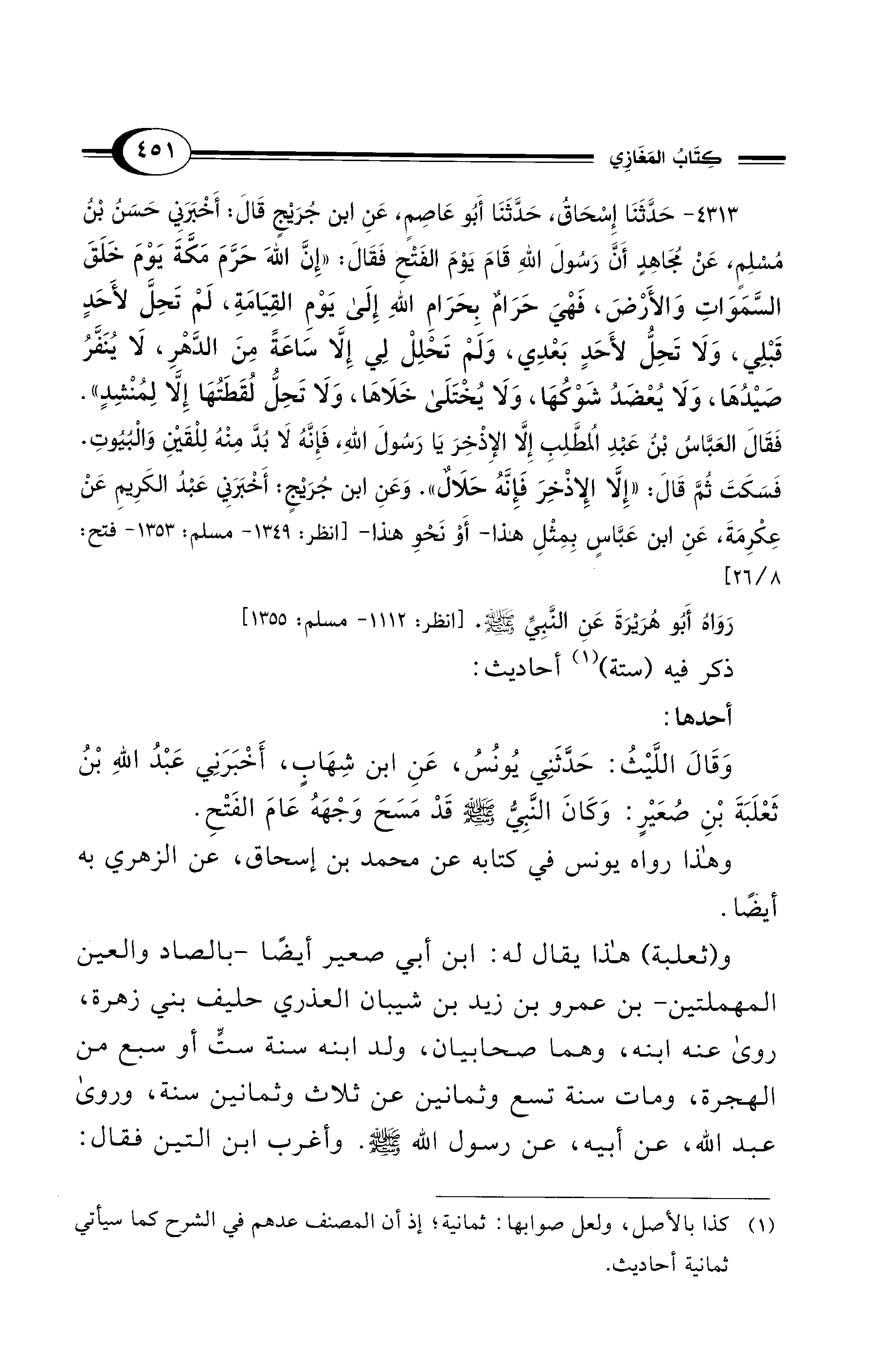 4313 - حَدَّثَنَا إِسْحَاقُ, حَدَّثَنَا أَبُو عَاصِمٍ, عَنِ ابْنِ جُرَيْجٍ قَالَ: أَخْبَرَنِي حَسَنُ بْنُ مُسْلِمٍ, عَنْ مُجَاهِدٍ أَنَّ رَسُولَ اللهِ قَامَ يَوْمَ الْفَتْحِ فَقَالَ: "إِنَّ اللهَ حَرَّمَ مَكَّةَ يَوْمَ خَلَقَ السَّمَوَاتِ وَالأَرْضَ، فَهْيَ حَرَامٌ بِحَرَامِ اللهِ إِلَى يَوْمِ الْقِيَامَةِ، لَمْ تَحِلَّ لأَحَدٍ قَبْلِي، وَلاَ تَحِلُّ لأَحَدٍ بَعْدِي، وَلَمْ تَحْلِلْ لِي إِلاَّ سَاعَةً مِنَ الدَّهْرِ، لاَ يُنَفَّرُ صَيْدُهَا، وَلاَ يُعْضَدُ شَوْكُهَا، وَلاَ يُخْتَلَى خَلاَهَا, وَلاَ تَحِلُّ لُقَطَتُهَا إِلاَّ لِمُنْشِدٍ". فَقَالَ الْعَبَّاسُ بْنُ عَبْدِ الْمُطَّلِبِ إِلاَّ الإِذْخِرَ يَا رَسُولَ اللهِ، فَإِنَّهُ لاَ بُدَّ مِنْهُ لِلْقَيْنِ وَالْبُيُوتِ. فَسَكَتَ ثُمَّ قَالَ: "إِلاَّ الإِذْخِرَ فَإِنَّهُ حَلاَلٌ".وَعَنِ ابْنِ جُرَيْجٍ: أَخْبَرَنِي عَبْدُ الْكَرِيمِ عَنْ عِكْرِمَةَ, عَنِ ابْنِ عَبَّاسٍ بِمِثْلِ هَذَا -أَوْ نَحْوِ هَذَا-[انظر: 1349 - مسلم: 1353 - فتح: 8/ 26]