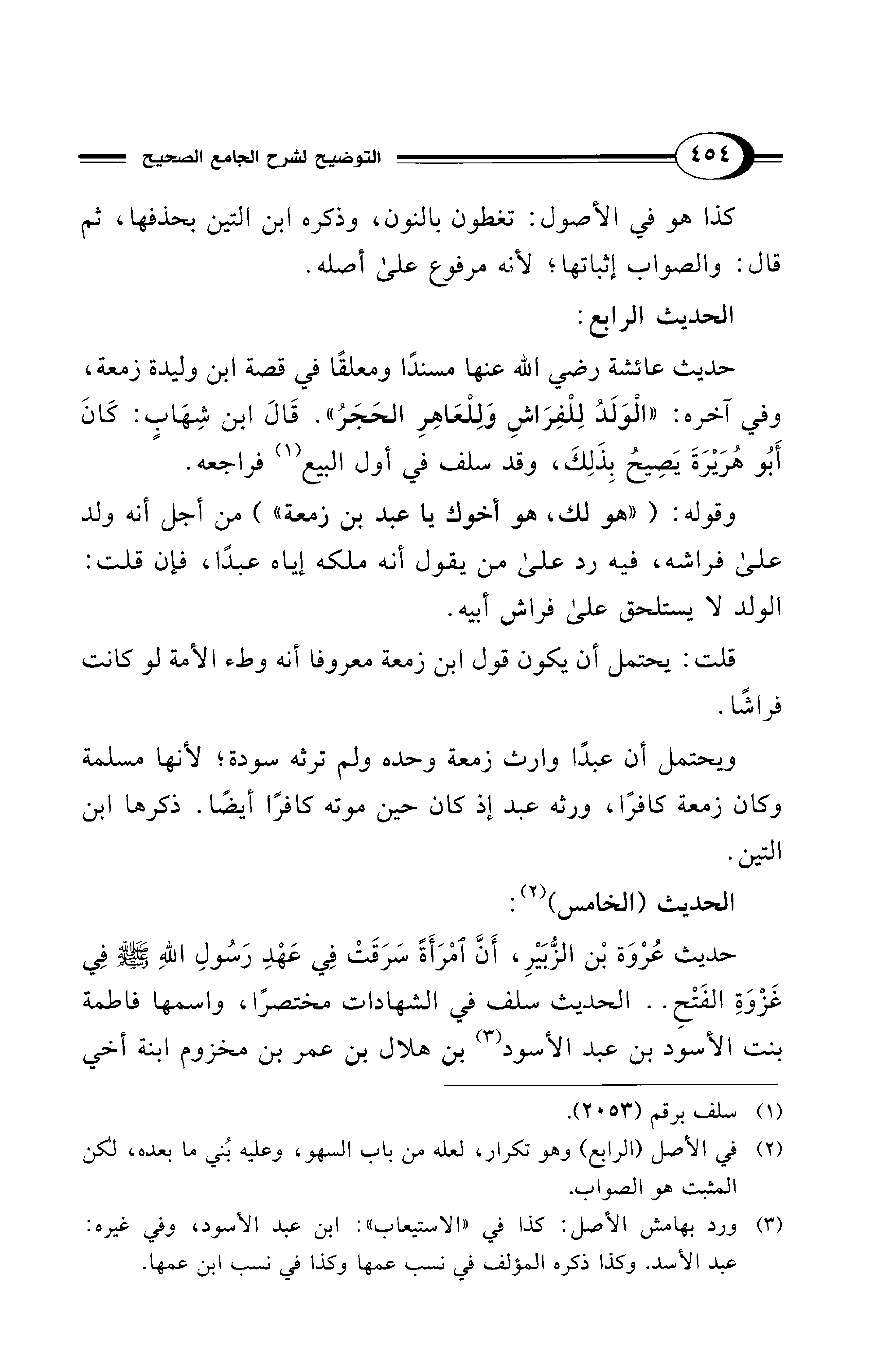 حديث عائشة رضي الله عنها مسندًا ومعلقًا في قصة ابن وليدة زمعة، وفي آخره: "الْوَلَدُ لِلْفِرَاشِ وَلِلْعَاهِرِ الحَجَرُ". قَالَ ابن شِهَابٍ: كَانَ أَبُو هُرَيْرَةَ يَصِيحُ بِذَلِكَ، وقد سلف في أول البيع (¬1) فراجعه.