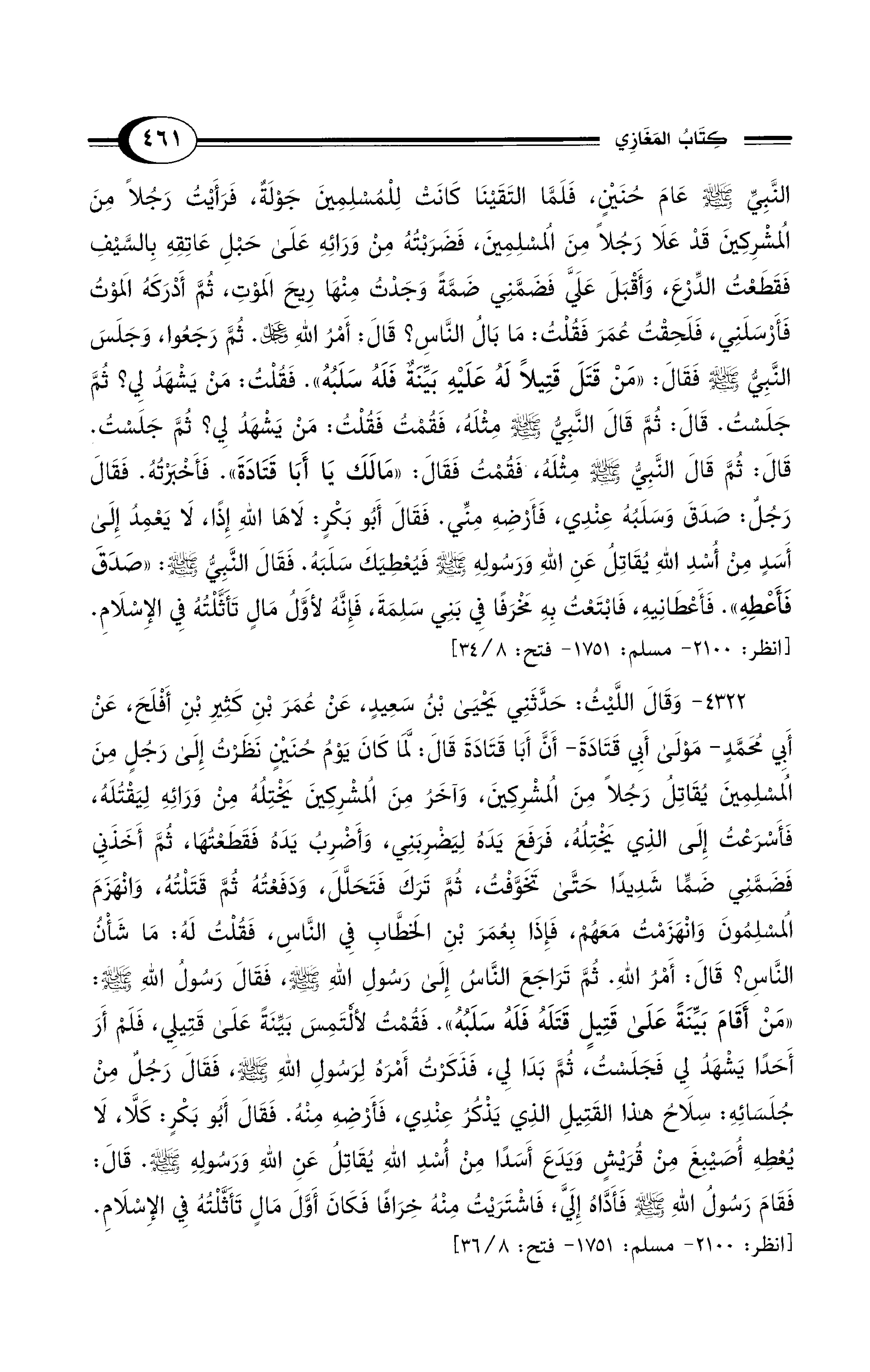 4322 - وَقَالَ اللَّيْثُ: حَدَّثَنِي يَحْيَى بْنُ سَعِيدٍ, عَنْ عُمَرَ بْنِ كَثِيرِ بْنِ أَفْلَحَ, عَنْ أَبِي مُحَمَّدٍ -مَوْلَى أَبِي قَتَادَة- أَنَّ أَبَا قَتَادَةَ قَالَ: لَمَّا كَانَ يَوْمُ حُنَيْنٍ نَظَرْتُ إِلَى رَجُلٍ مِنَ الْمُسْلِمِينَ يُقَاتِلُ رَجُلاً مِنَ الْمُشْرِكِينَ، وَآخَرُ مِنَ الْمُشْرِكِينَ يَخْتِلُهُ مِنْ وَرَائِهِ لِيَقْتُلَهُ، فَأَسْرَعْتُ إِلَى الَّذِي يَخْتِلُهُ, فَرَفَعَ يَدَهُ لِيَضْرِبَنِي، وَأَضْرِبُ يَدَهُ، فَقَطَعْتُهَا، ثُمَّ أَخَذَنِي، فَضَمَّنِي ضَمًّا شَدِيدًا حَتَّى تَخَوَّفْتُ، ثُمَّ تَرَكَ فَتَحَلَّلَ، وَدَفَعْتُهُ ثُمَّ قَتَلْتُهُ، وَانْهَزَمَ الْمُسْلِمُونَ، وَانْهَزَمْتُ مَعَهُمْ، فَإِذَا بِعُمَرَ بْنِ الْخَطَّابِ فِي النَّاسِ، فَقُلْتُ لَهُ: مَا شَأْنُ النَّاسِ؟ قَالَ: أَمْرُ اللَّه. ثُمَّ تَرَاجَعَ النَّاسُ إِلَى رَسُولِ اللهِ - صلى الله عليه وسلم - فَقَالَ رَسُولُ اللهِ - صلى الله عليه وسلم -: "مَنْ أَقَامَ بَيِّنَةً عَلَى قَتِيلٍ قَتَلَهُ فَلَهُ سَلَبُهُ". فَقُمْتُ لأَلْتَمِسَ بَيِّنَةً عَلَى قَتِيلِي، فَلَمْ أَرَ أَحَدًا يَشْهَدُ لِي فَجَلَسْتُ، ثُمَّ بَدَا لِي، فَذَكَرْتُ أَمْرَهُ لِرَسُولِ اللهِ - صلى الله عليه وسلم - فَقَالَ رَجُلٌ مِنْ جُلَسَائِهِ: سِلاَحُ هَذَا الْقَتِيلِ الَّذِي يَذْكُرُ عِنْدِي, فَأَرْضِهِ مِنْهُ. فَقَالَ أَبُو بَكْرٍ: كَلاَّ, لاَ يُعْطِهِ أُصَيْبِغَ مِنْ قُرَيْشٍ، وَيَدَعَ أَسَدًا مِنْ أُسْدِ اللهِ يُقَاتِلُ عَنِ اللهِ وَرَسُولِهِ - صلى الله عليه وسلم -. قَالَ: فَقَامَ رَسُولُ اللهِ - صلى الله عليه وسلم - فَأَدَّاهُ إِلَيَّ؛ فَاشْتَرَيْتُ مِنْهُ خِرَافًا فَكَانَ أَوَّلَ مَالٍ تَأَثَّلْتُهُ فِي الإِسْلاَمِ. [انظر: 2100 - مسلم: 1751 - فتح: 8/ 36]